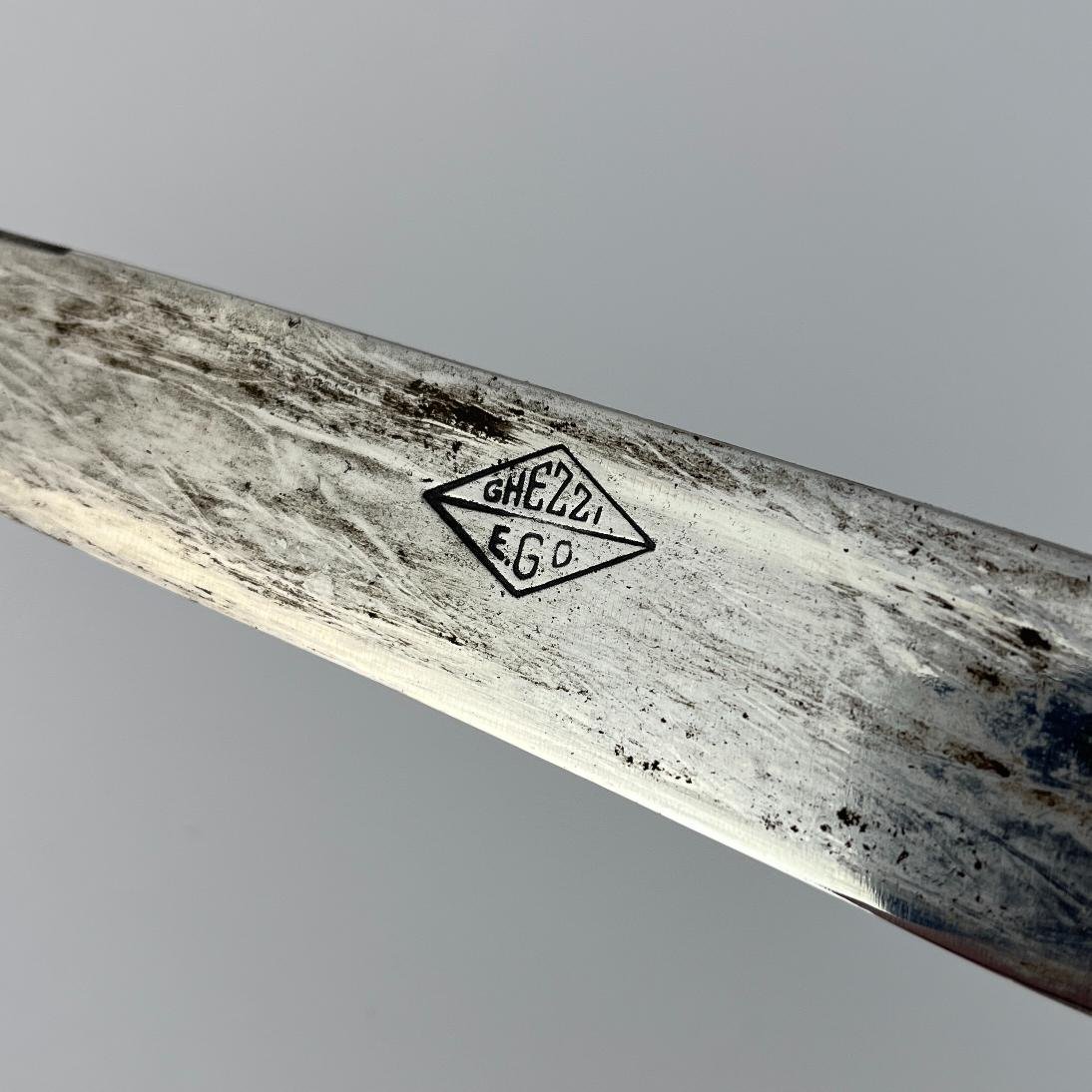 Cuchillo criollo uruguayo. Hoja «Ghezzi». Cabo en plata y oro cincelado «hojas y flores». Largo total 32 cm. Vaina en cuero marrón.