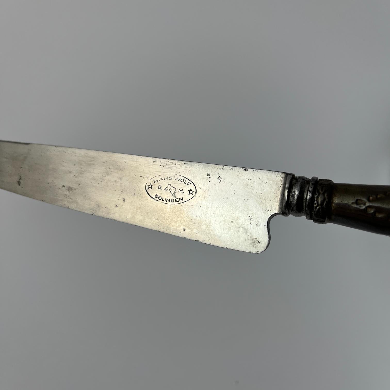 Cuchillo criollo uruguayo. Hoja «Hans Wolf», Solingen. Cabo en plata y oro cincelado «hojas y flores». Largo 29 cm.