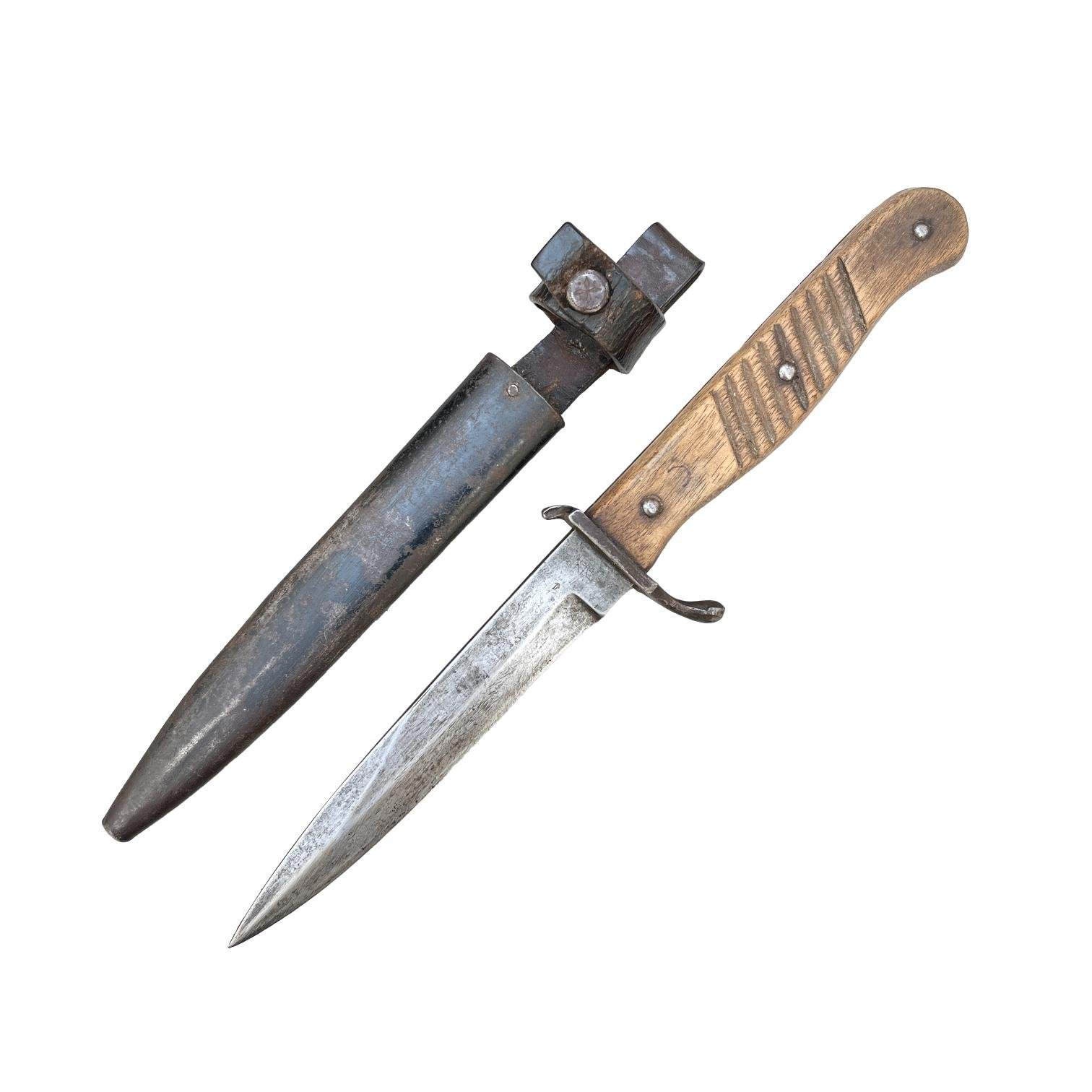 Cuchillo alemán de trinchera, WWI, con empuñadura en madera gallonada y vaina metálica. Marcado «Ern Wald Rheinl». Largo 27,5 cm.