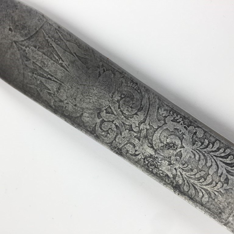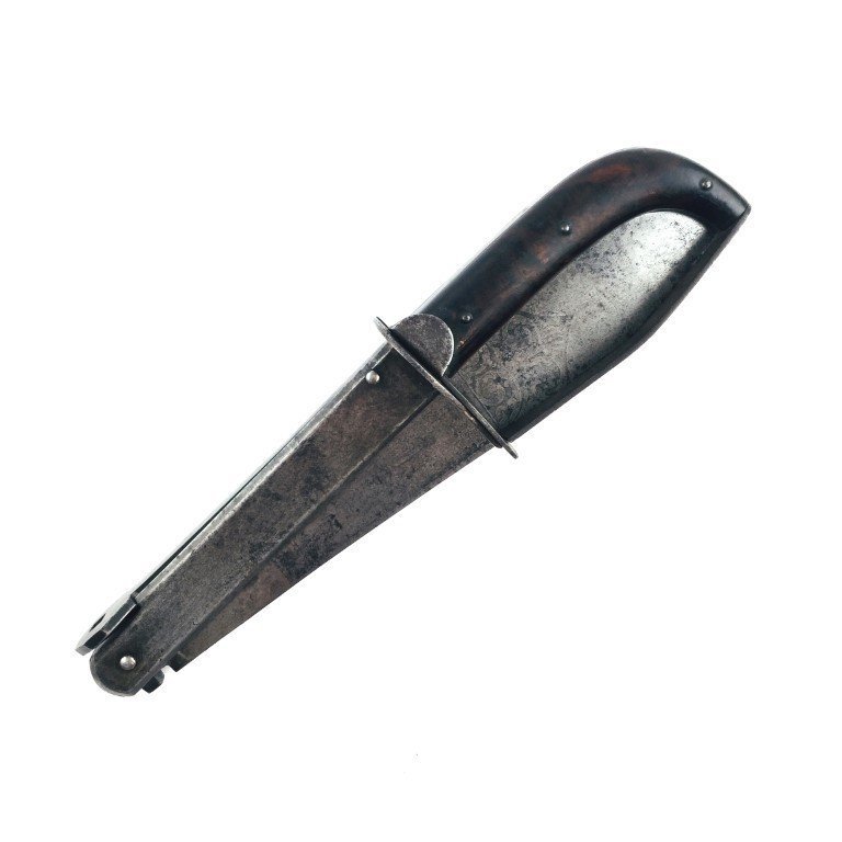 Cuchillo francés de caza tipo machete, siglo XIX. Automático. Hoja grabada al ácido «escena de pueblo» y «escena militar». Cachas en madera lisa. Largo total abierto 51 cm.