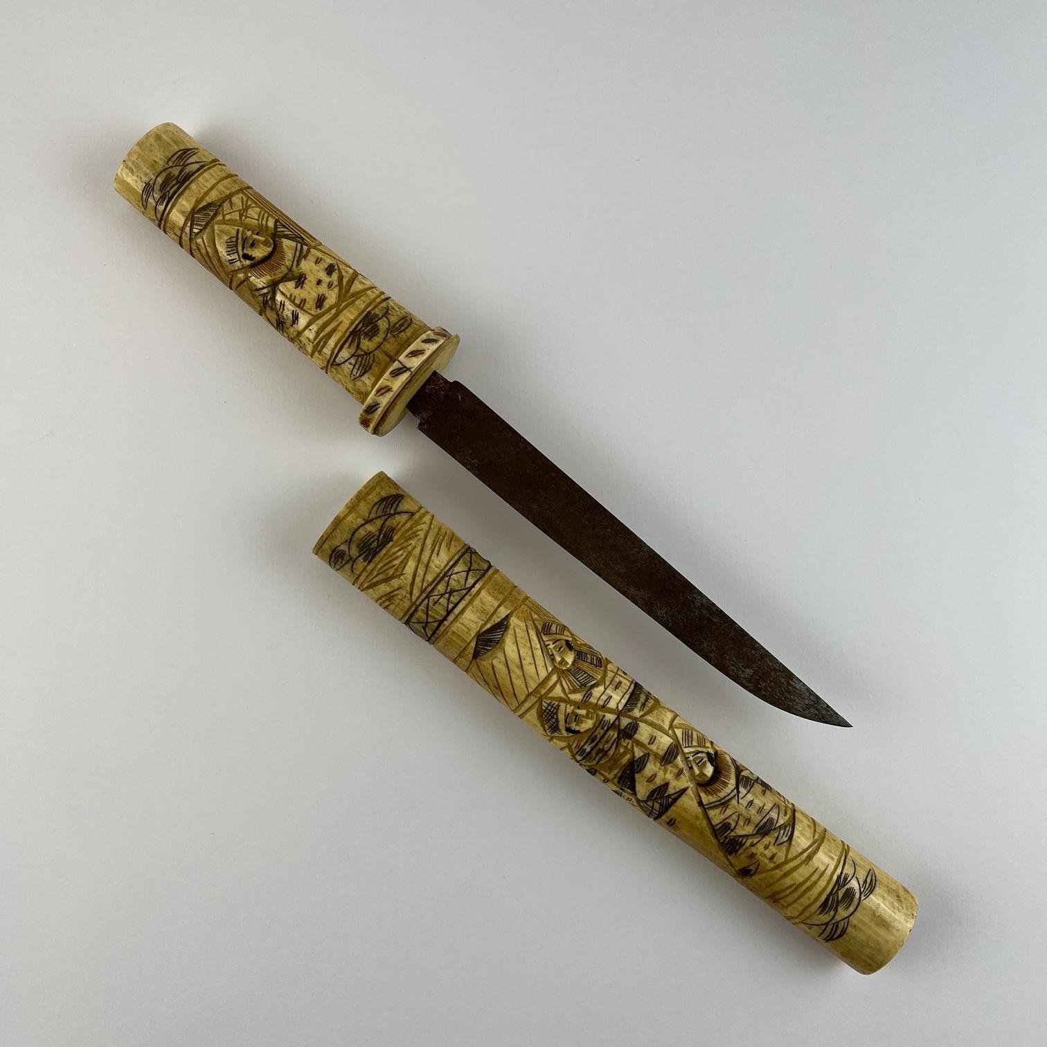 Cuchillo japonés tipo tanto con cabo y vaina en hueso tallado «herreros » y policromado. Largo 29 cm.