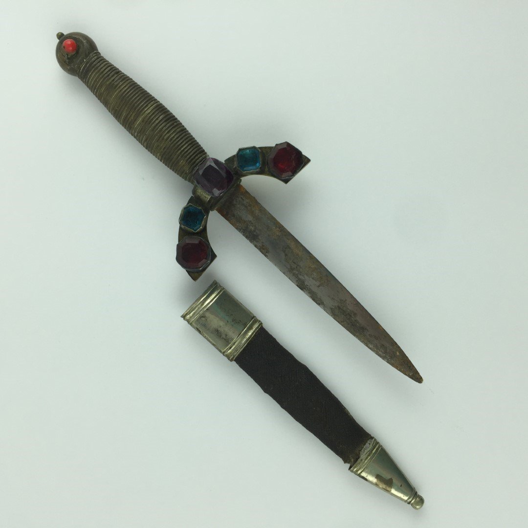 Pequeña daga europea. Cabo en bronce. Gavilán decorado con piedras color. Vaina forrada en cuero negro, con bocavaina y puntera en metal blanco. Largo 20 cm.