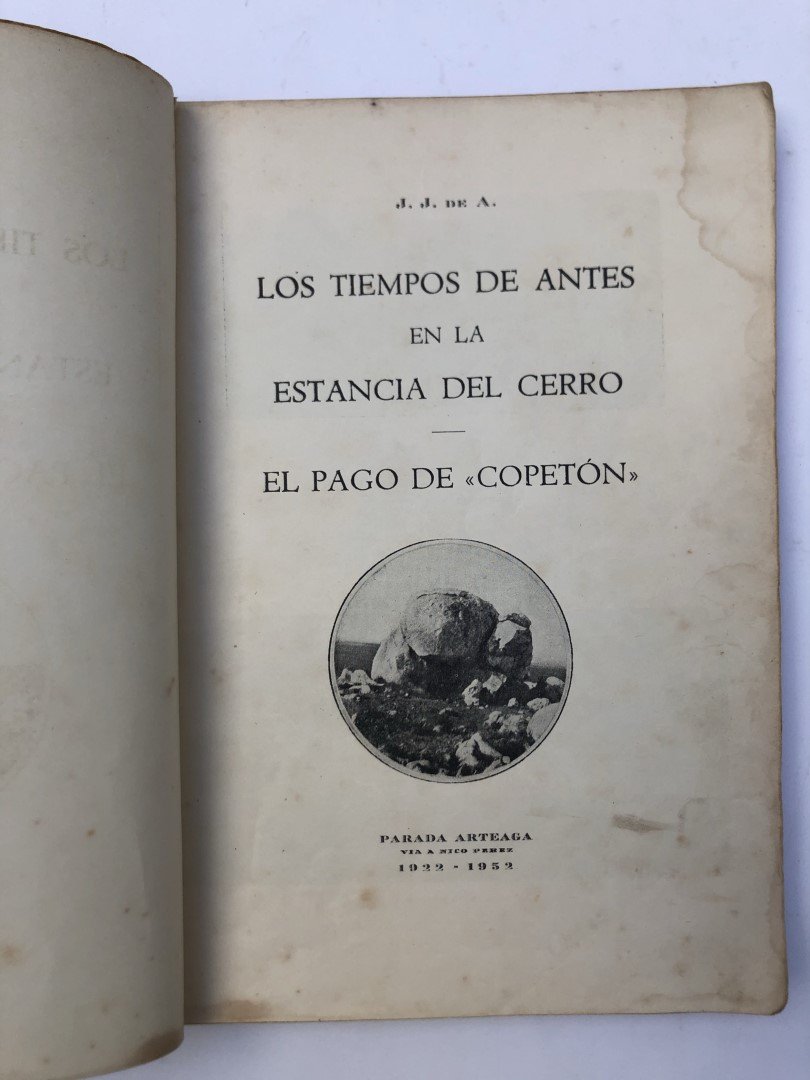 DE A. J.J.: Los tiempos de antes en la estancia del Cerro. El pago de Copetón. Montevideo, Talleres Gráficos de la Impresora Adroher. 1952. Encuadernación rústica del editor.