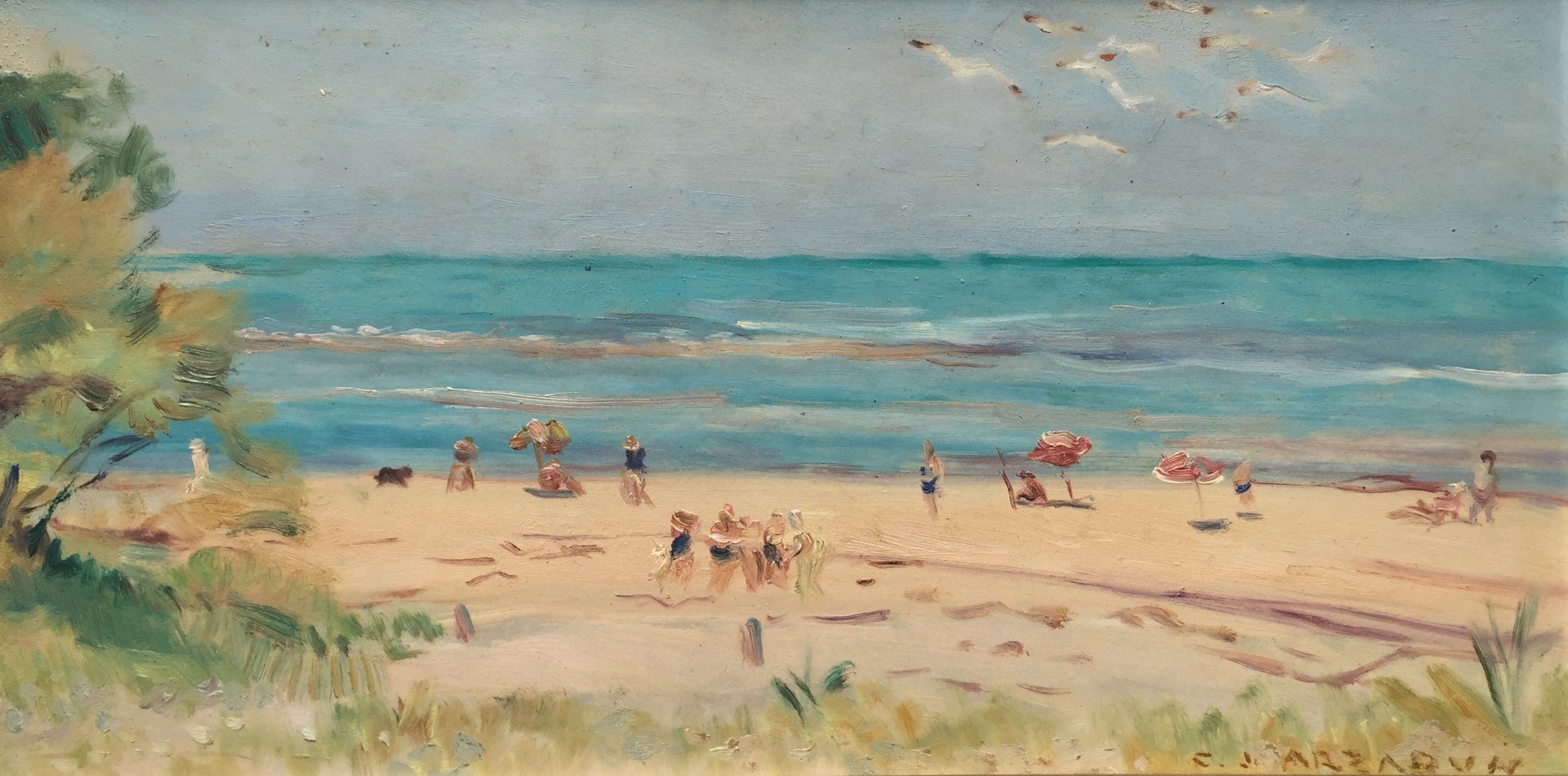 DE ARZADUN, Carmelo (escuela uruguaya, 1888-1968). Óleo sobre cartón. «Playa Las Flores.» Firmado abajo a la derecha. 28 x 54 cm.