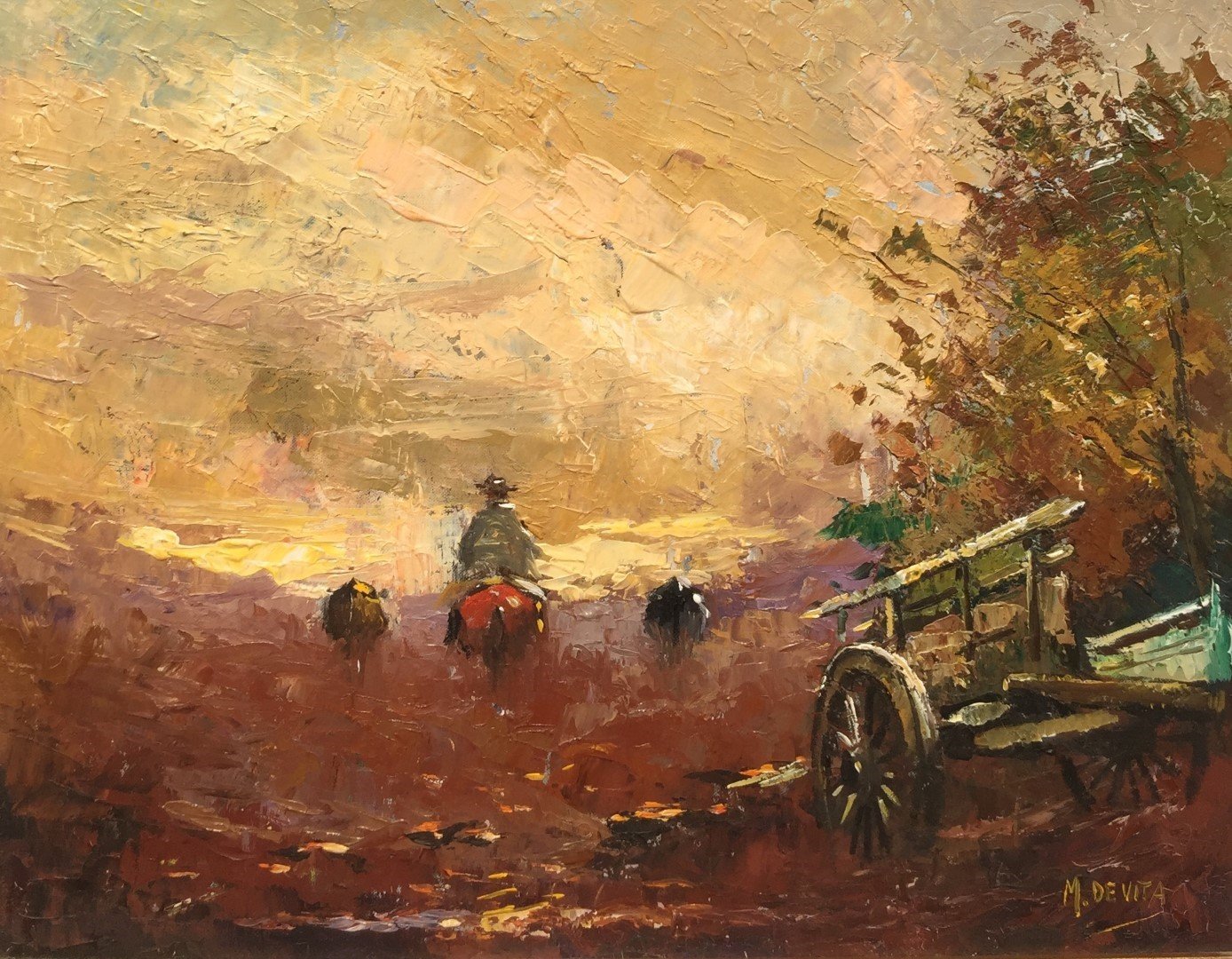 DE VITA, Miguel (escuela uruguaya, 1923-2004). Óleo sobre tela. «Arriero y carreta.» Firmado abajo a la derecha. 40 x 50 cm.