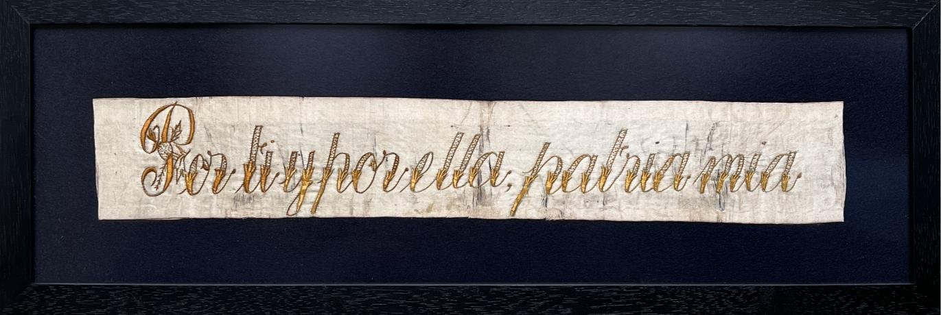 Divisa del Partido Nacional en raso de seda con leyenda «Por ti y por ella, patria mía» bordada en hilo marrón. Período Revoluciones Saravistas, 1897-1904. 45 x 7 cm. Enmarcada.