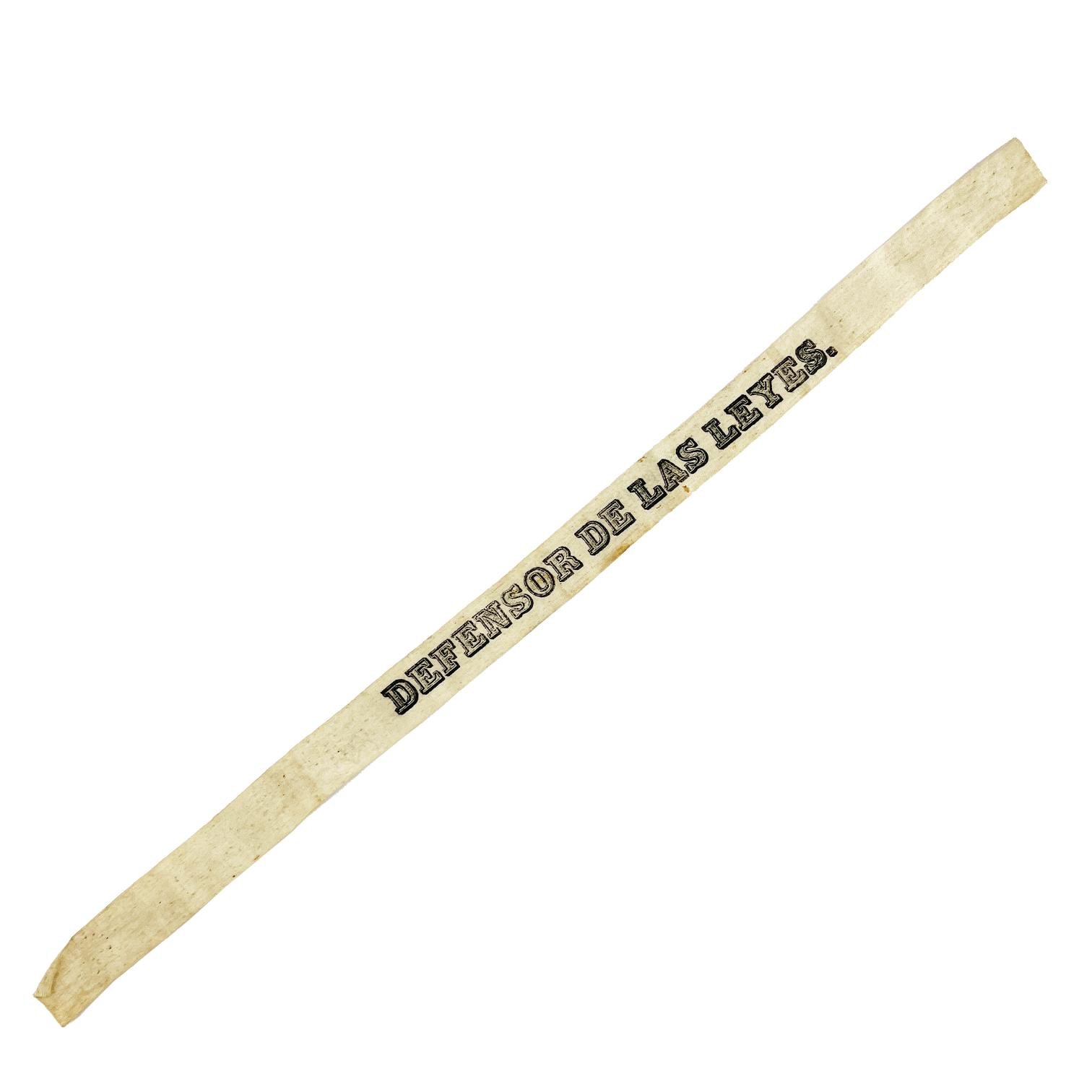 Divisa uruguaya del Partido Blanco, s. XIX, en tela estampada con leyenda «Defensor de las Leyes». 3 x 61 cm.