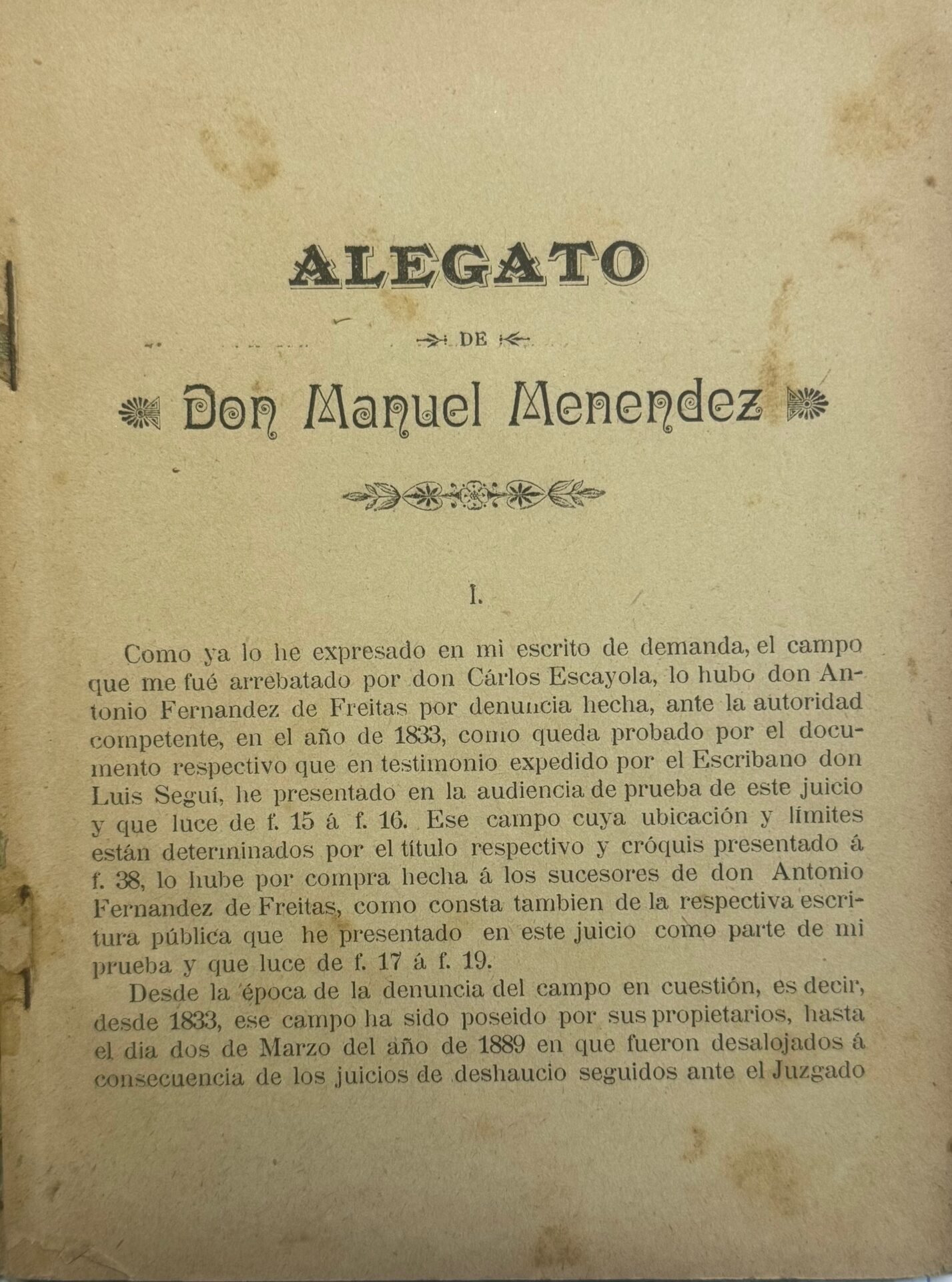 «Juicio posesorio iniciado por Don Manuel Méndez contra Carlos Escayola. Departamento de Tacuarembó.» Tip. La Parisiense. Montevideo, 1891.