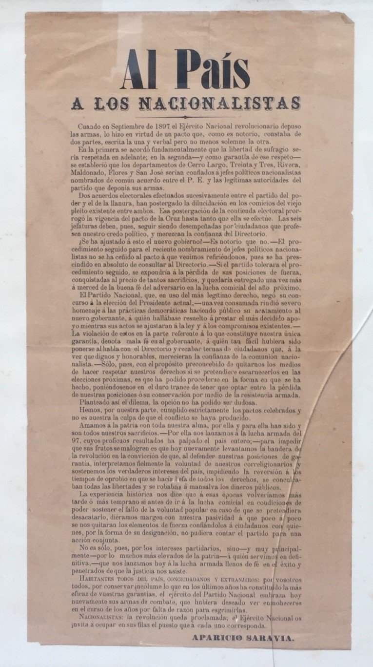 Documento impreso dirigido «Al País, a los Nacionalistas», firmado por Aparicio Saravia, donde se expresa que «la revolución queda proclamada y el Ejército Nacional los invita a ocupar en sus filas el puesto que a cada uno corresponda», proclama revolucionaria de «El Cordobés» acaecida el 16 de marzo de 1903. 1 folio. 37 x 19 cm. Enmarcado.