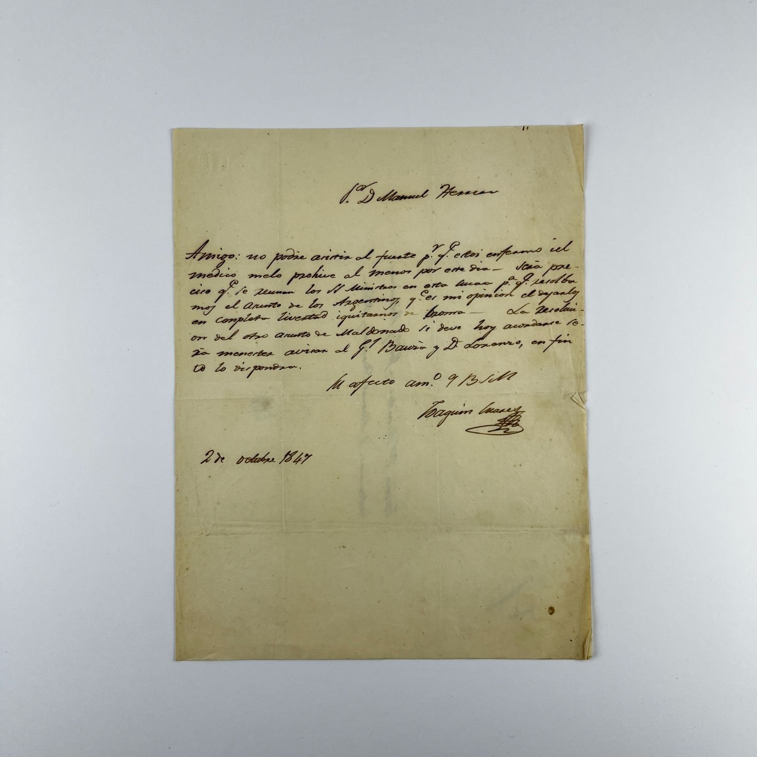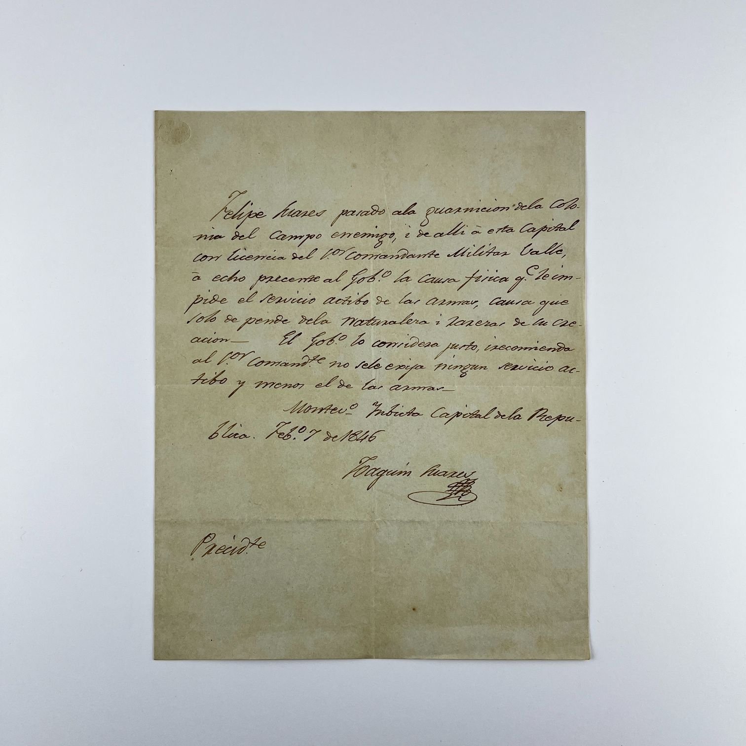 Dos cartas manuscritas época Guerra Grande firmadas por el presidente de la República Joaquín Suárez, una de ellas dirigida al ministro de Gobierno y Relaciones Exteriores Manuel Herrera y Obes, fechada el 2 de octubre de 1847, por la cual Suárez le informa a su “amigo” que “no podré asistir al fuerte porque estoy enfermo y el médico me lo prohíbe al menos por este día” y que “será preciso que resolvamos el asunto de los argentinos, que es mi opinión el dejarlos en completa libertad.” Junto con documento impreso y manuscrito, encabezado con escudo de armas uruguayo antiguo, sellado en lacre con escudo de armas uruguayo, firmado por el presidente de la República Joaquín Suárez y el ministro de Guerra y Marina Melchor Pacheco y Obes y fechado el 14 de marzo de 1844, por el cual se otorga “al ciudadano Lorenzo Otero, atendiendo a sus méritos y servicios”, el empleo de teniente segundo de la 4ª compañía de la Guardia Nacional Pasiva. 3 folio.