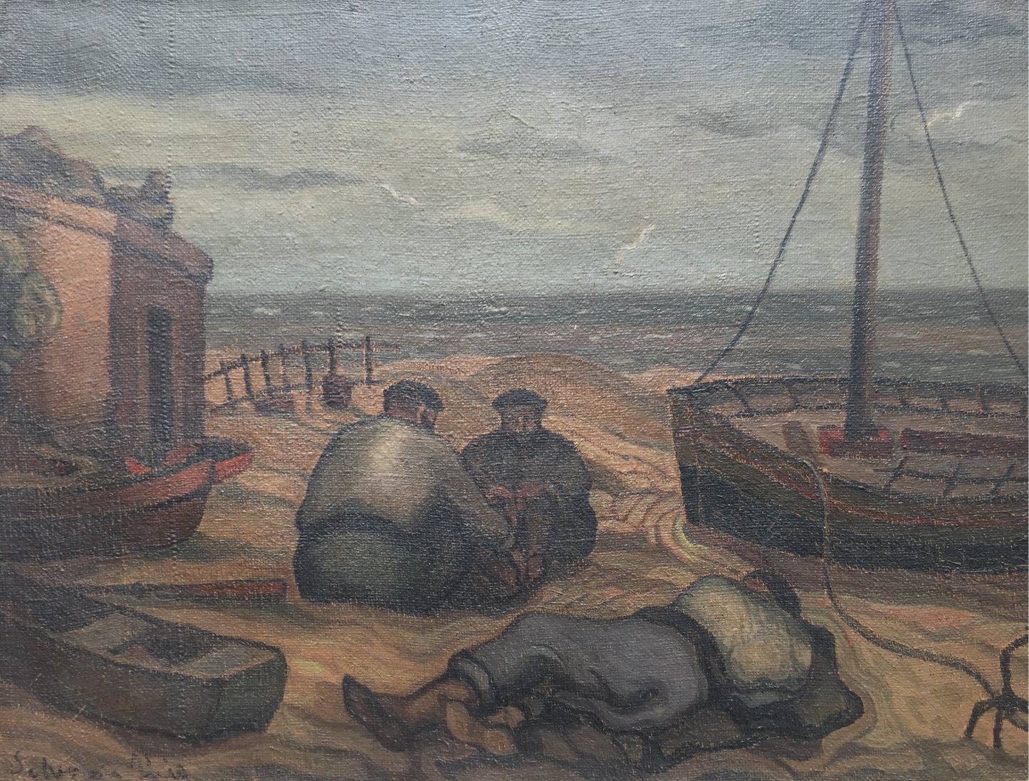 DOLCEY SCHENONE PUIG (1886 – 1952). Óleo sobre tela «Pescadores». Firmado abajo a la izquierda. Medidas: alto 68 cm – ancho 88 cm.
