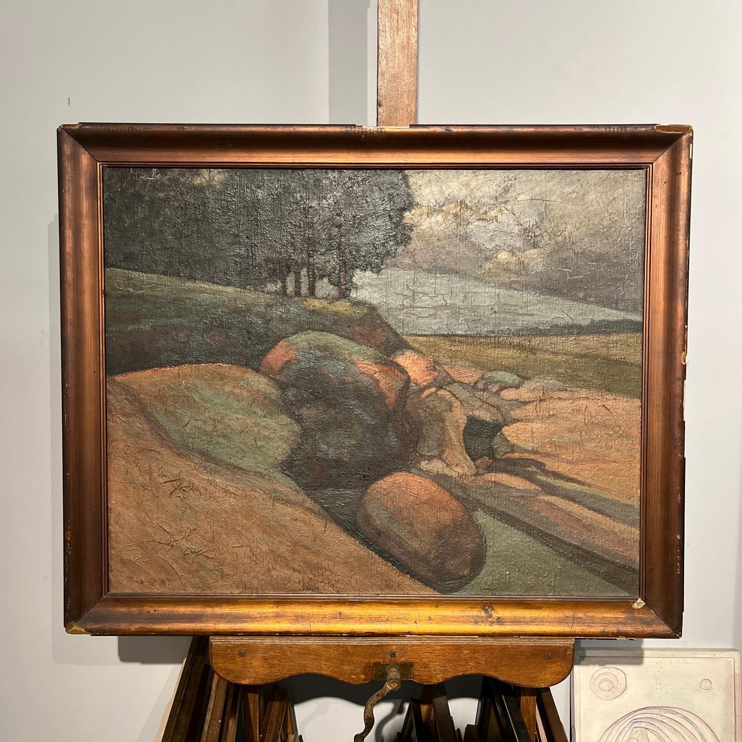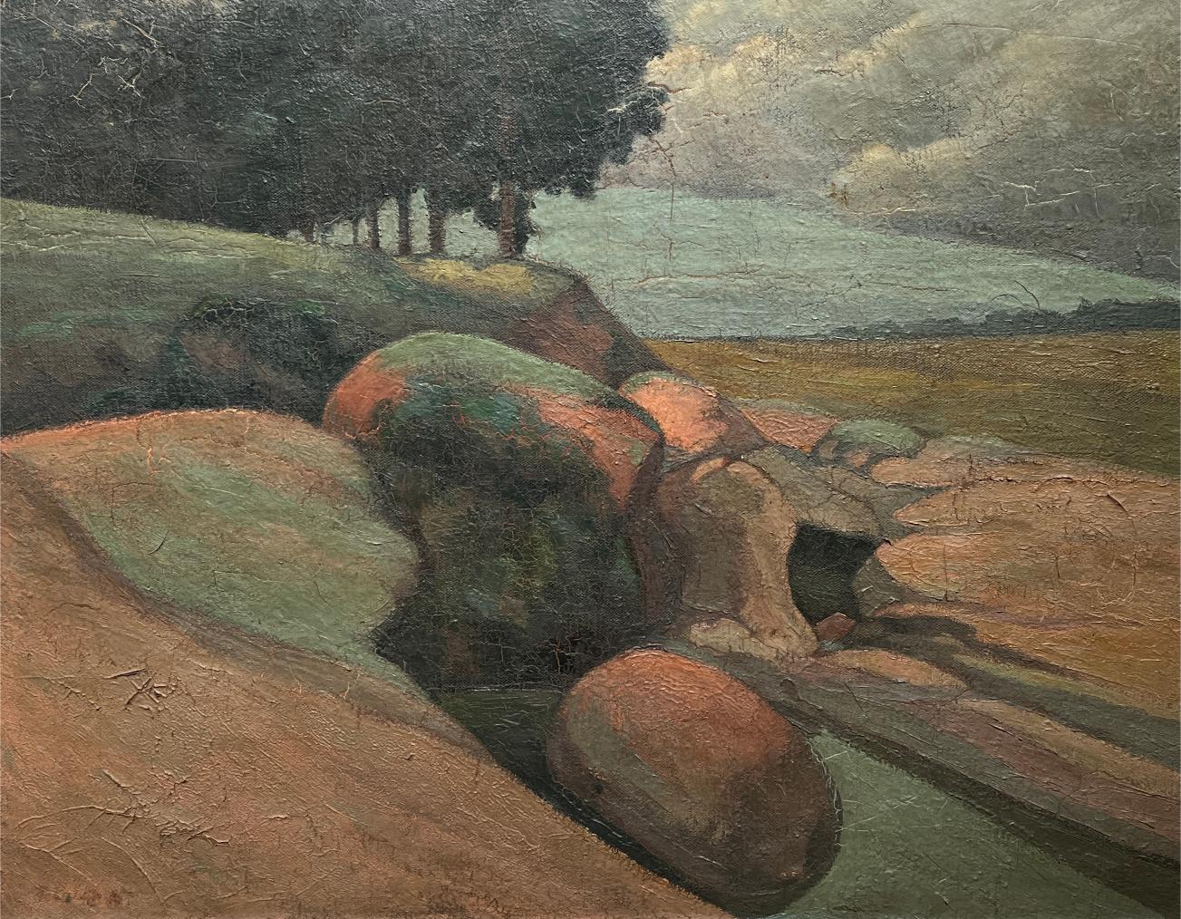 DOMINGO BAZZURRO (Escuela uruguaya, 1886-1962) Óleo sobre tela «Paisaje» Firmado con iniciales «DB» al dorso 81 x 101 cm