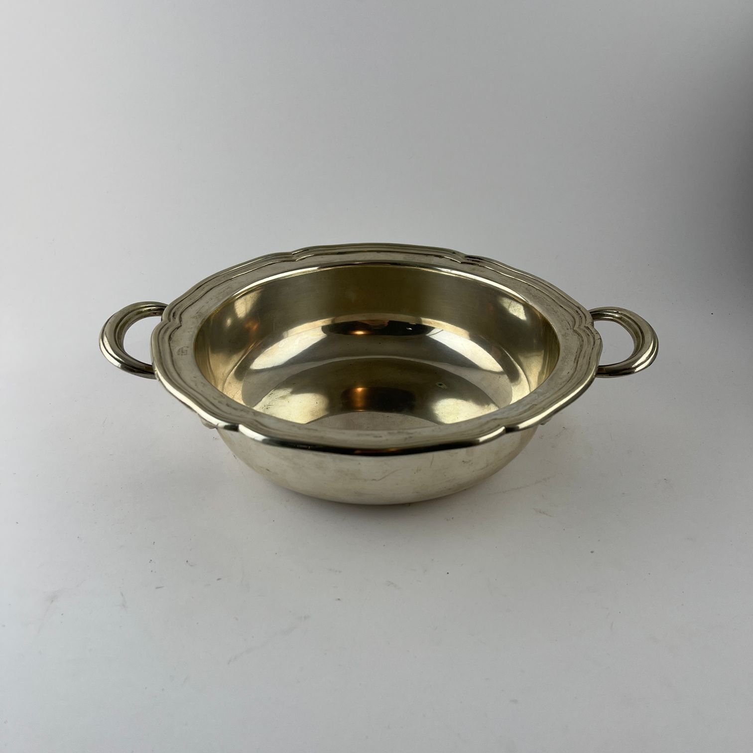 Dos fuentes alemanas en plata, una lisa con asas y borde en ondas (diámetro 22 cm), otra con borde perlado (diámetro 20 cm). Peso total 900 gr.