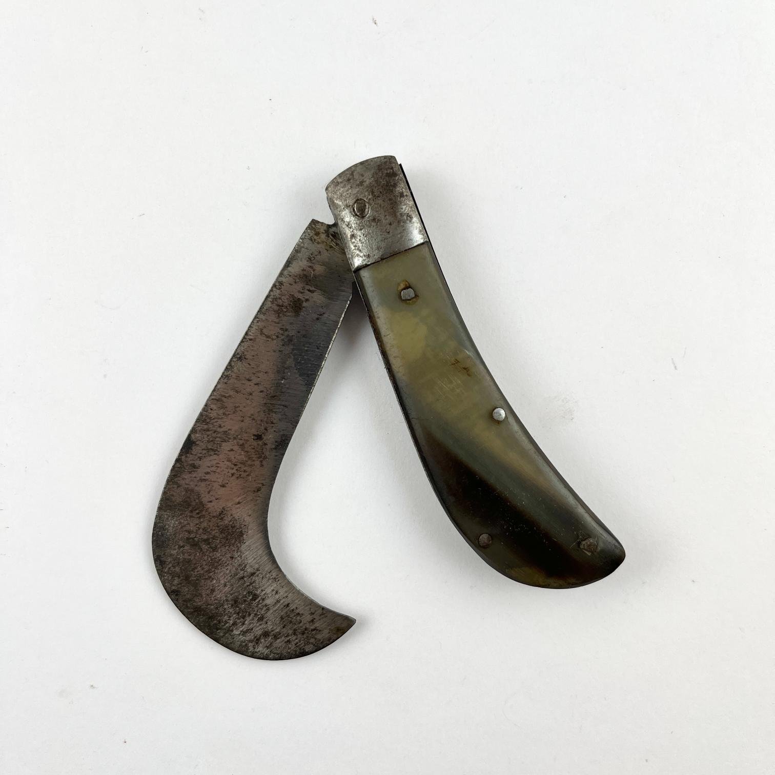 Dos navajas españolas s. XIX, curvas, con cachas en guampa. Largos cerradas 15 y 9 cm.