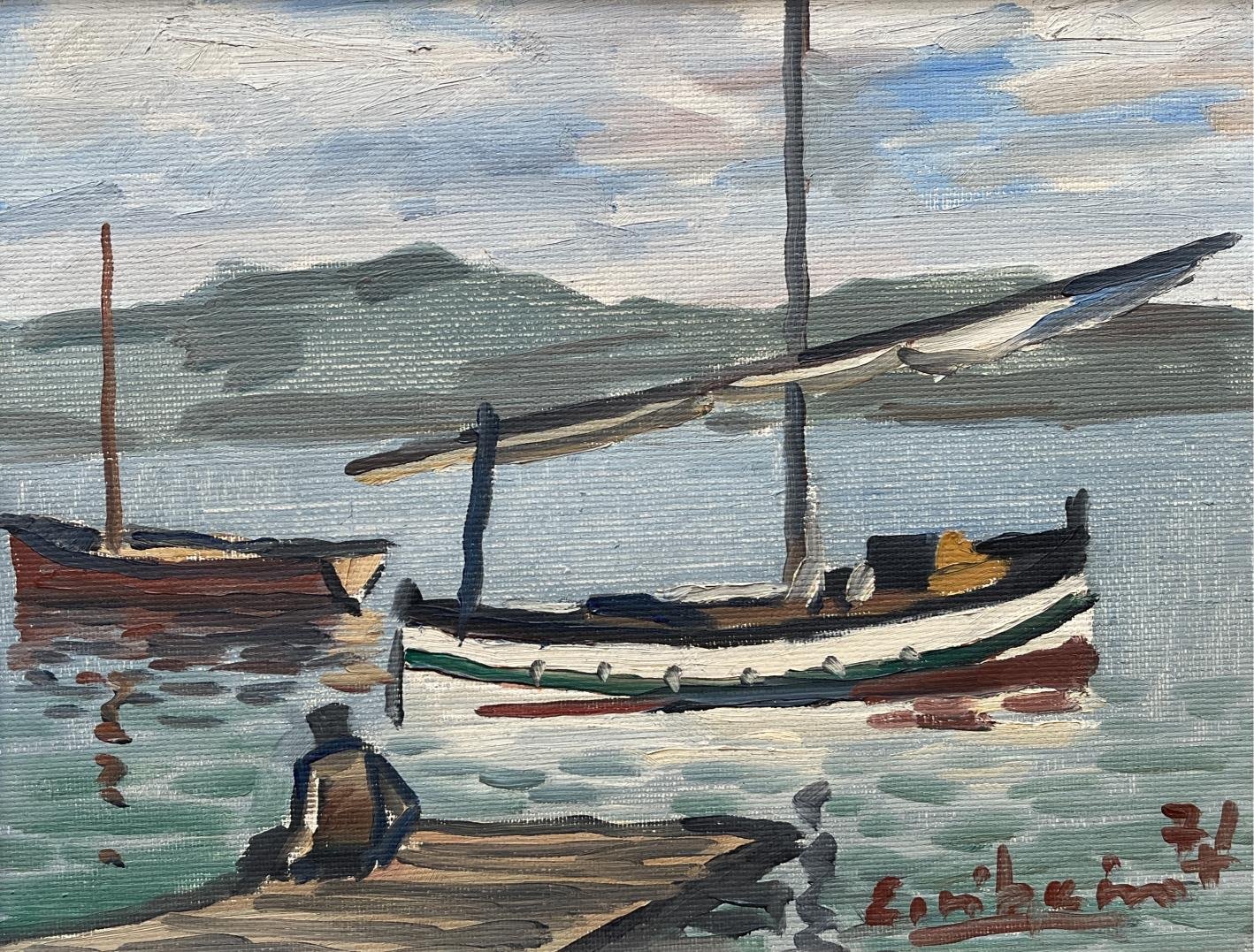 EDGARDO RIBEIRO (Escuela uruguaya, 1921-2006) Óleo sobre tela «Barcaza en el Mediterráneo» Firmado y fechado «77» abajo a la derecha 26 x 34 cm
