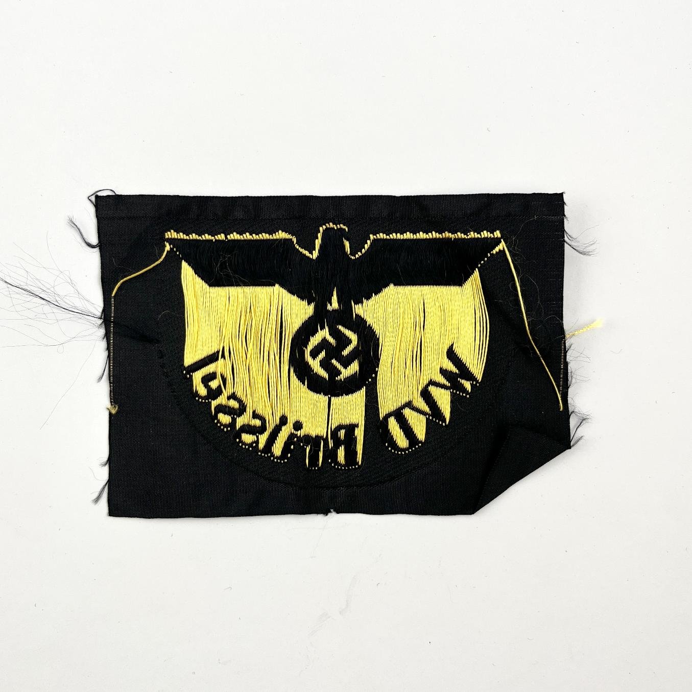 Emblema de manga alemán época nacionalsocialista para miembros de la Dirección de tráfico ferroviario de la Wehrmacht en Bruselas, en tela negra bordada en hilo dorado, con águila y esvástica e inscripción “WVD Brüssel”. WWII. 10 x 7 cm.