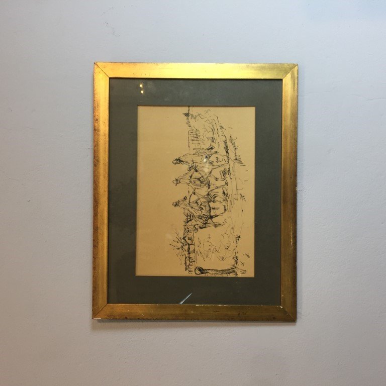 CASTELLS CAPURRO, Enrique (escuela uruguaya, 1913-1987). Tinta sobre papel «gauchos a caballo volviendo a los ranchos». Sin firma. 28 x 40 cm.
