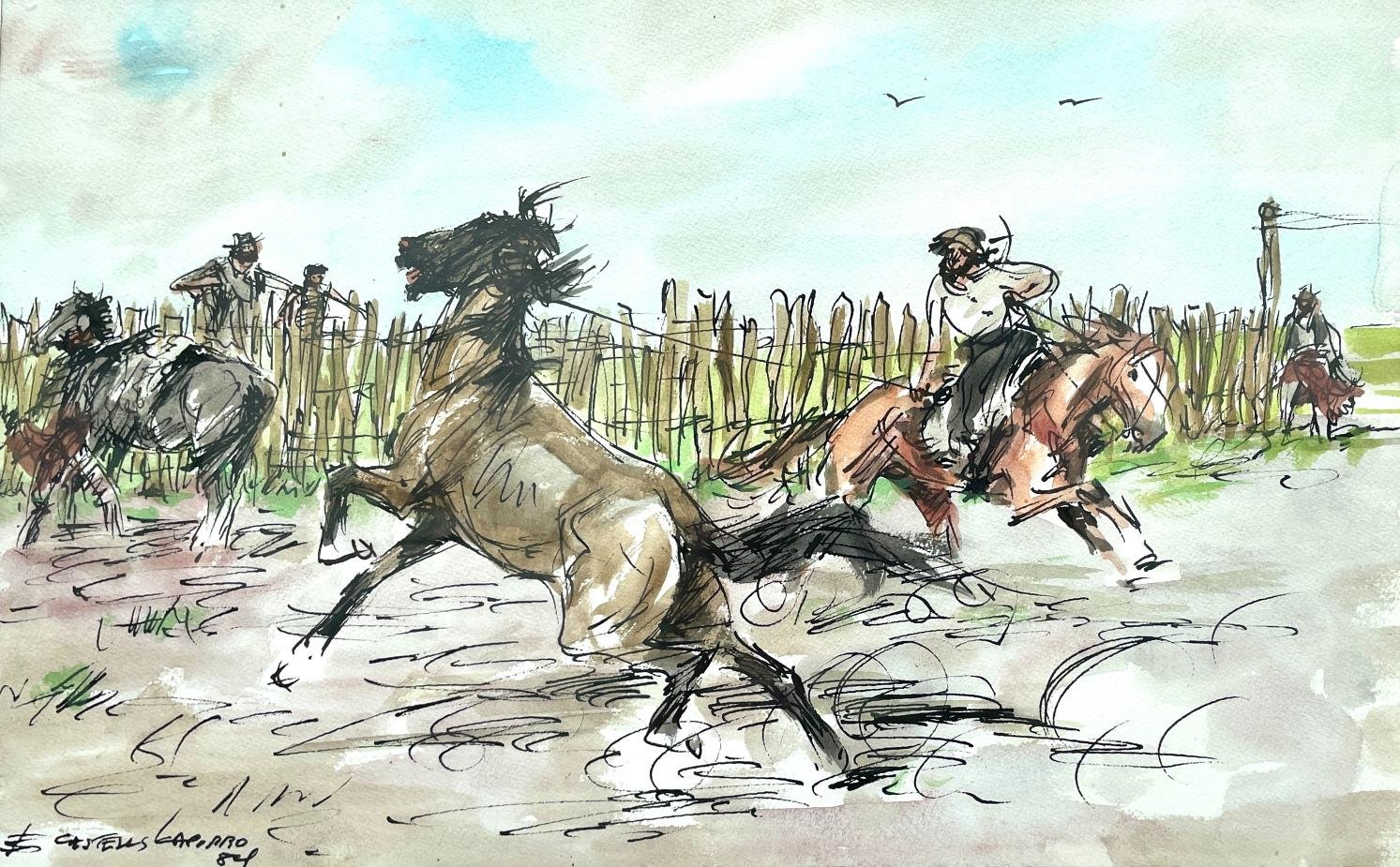 ENRIQUE CASTELLS CAPURRO (escuela uruguaya, 1913-1987). Acuarela sobre papel. «La doma.» Firmado y fechado «84» abajo a la izquierda 31 x 49 cm.