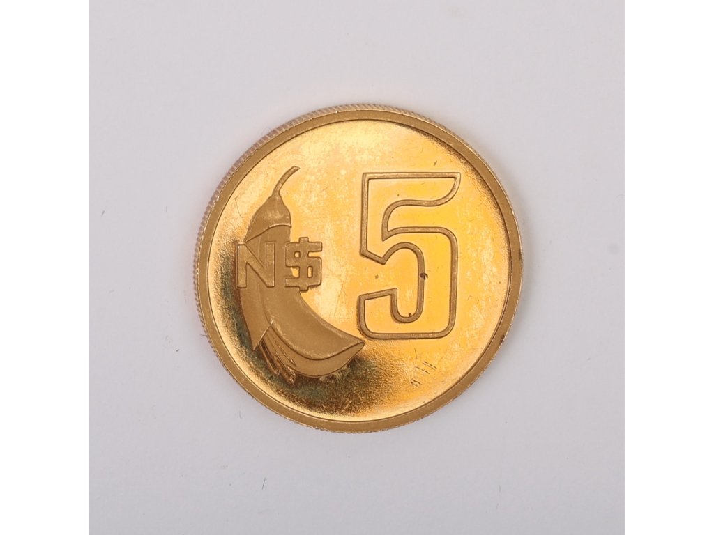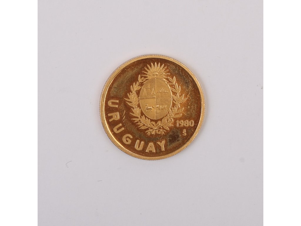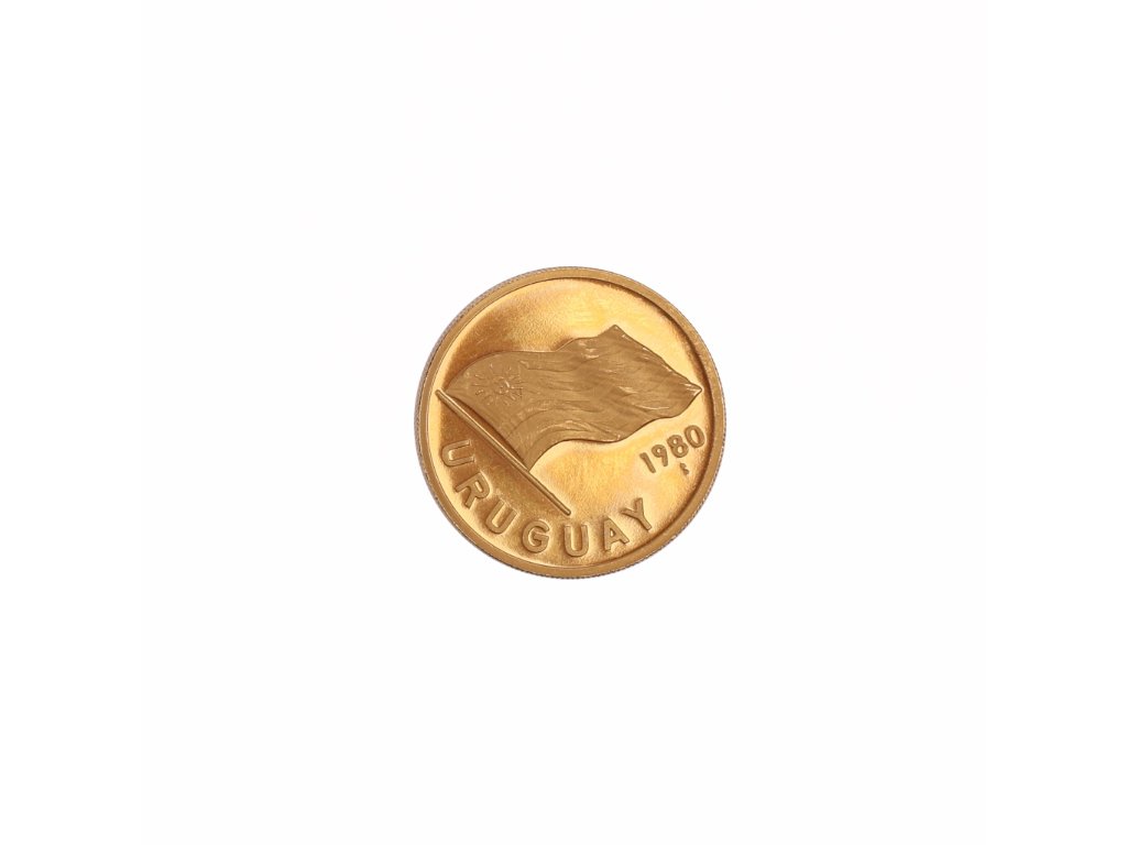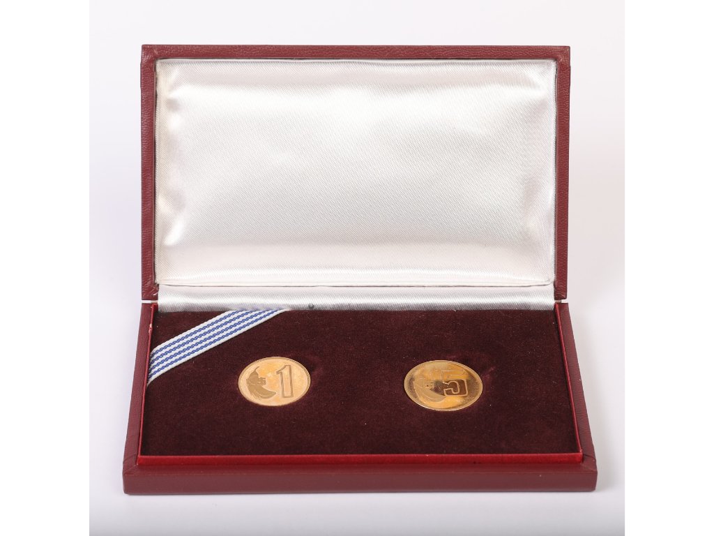 Set de ensayos de dos monedas uruguayas en oro denominaciones 1 y 5 pesos del año 1980. En estuche original. Edición limitada de veintidós sets.