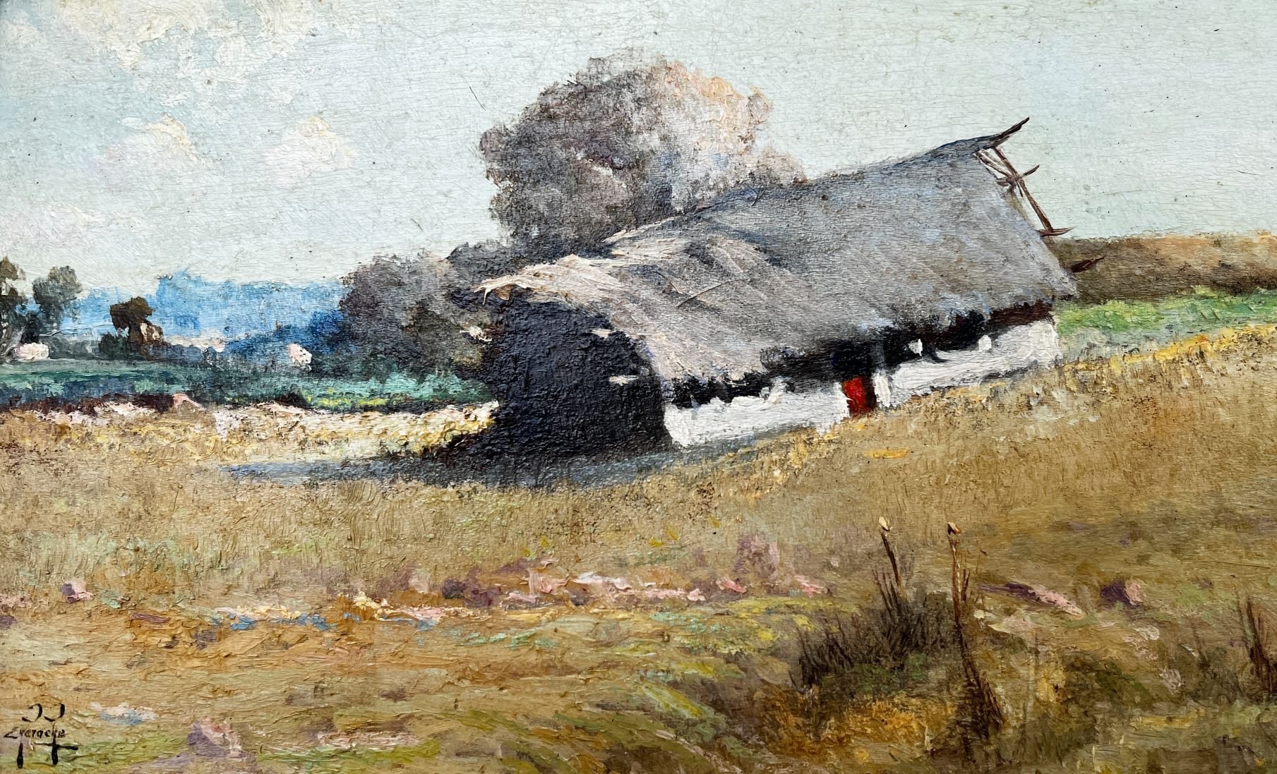 ERNESTO LAROCHE (Uruguay, 1879-1940). Óleo sobre cartón. “Paisaje de campo y rancho.” Firmado abajo a la izquierda. 12 x 20 cm.