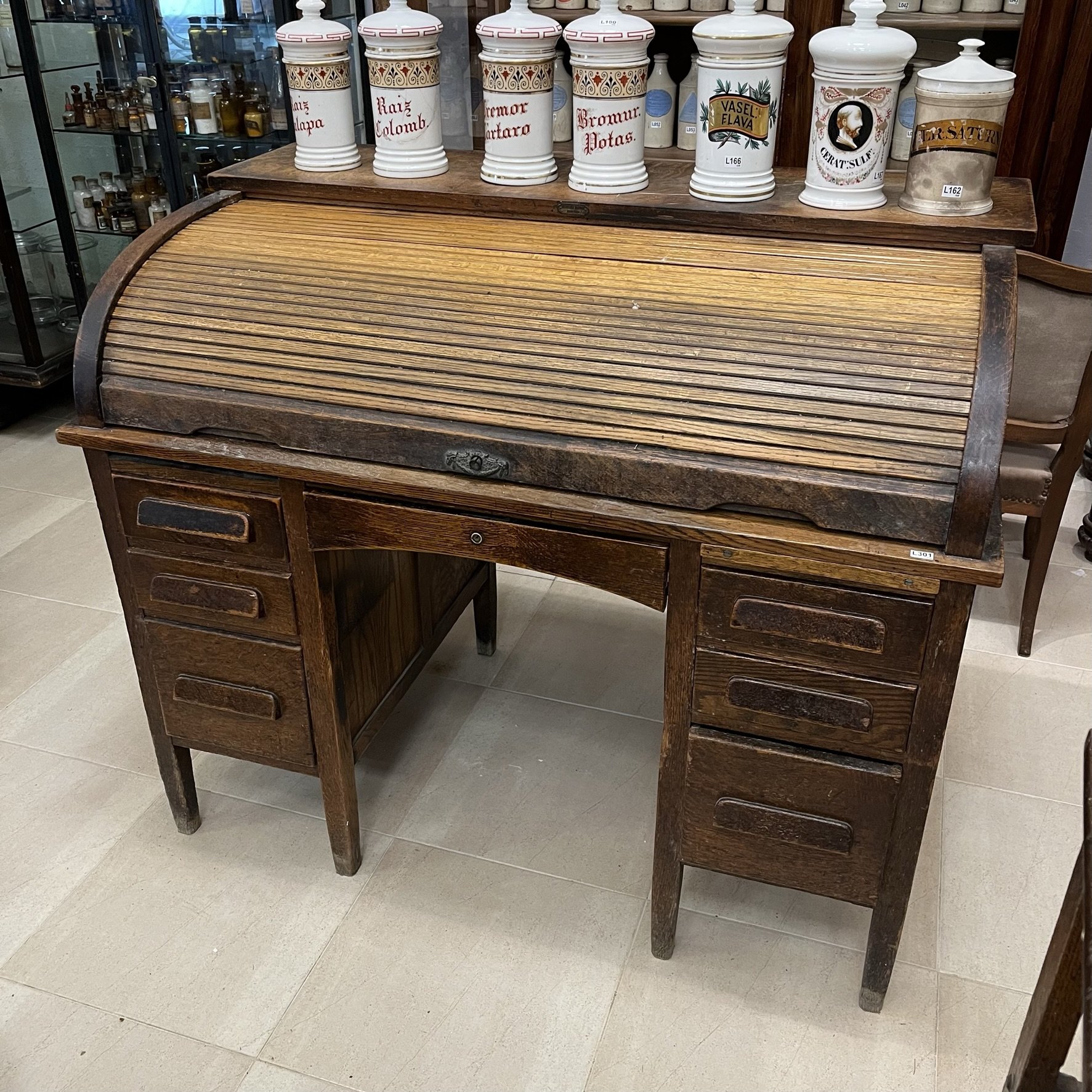 Escritorio cortina en roble. Siete cajones. Alzada con ocho cajones y seis divisiones. 105 x 127 x 76 cm.