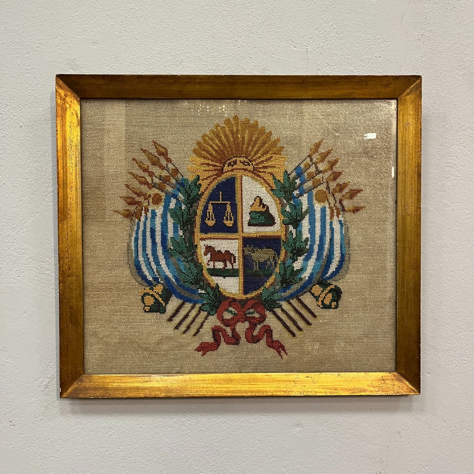 Escudo de armas uruguayo antiguo totalmente realizado en mostacillas. 40 x 45 cm. Enmarcado.