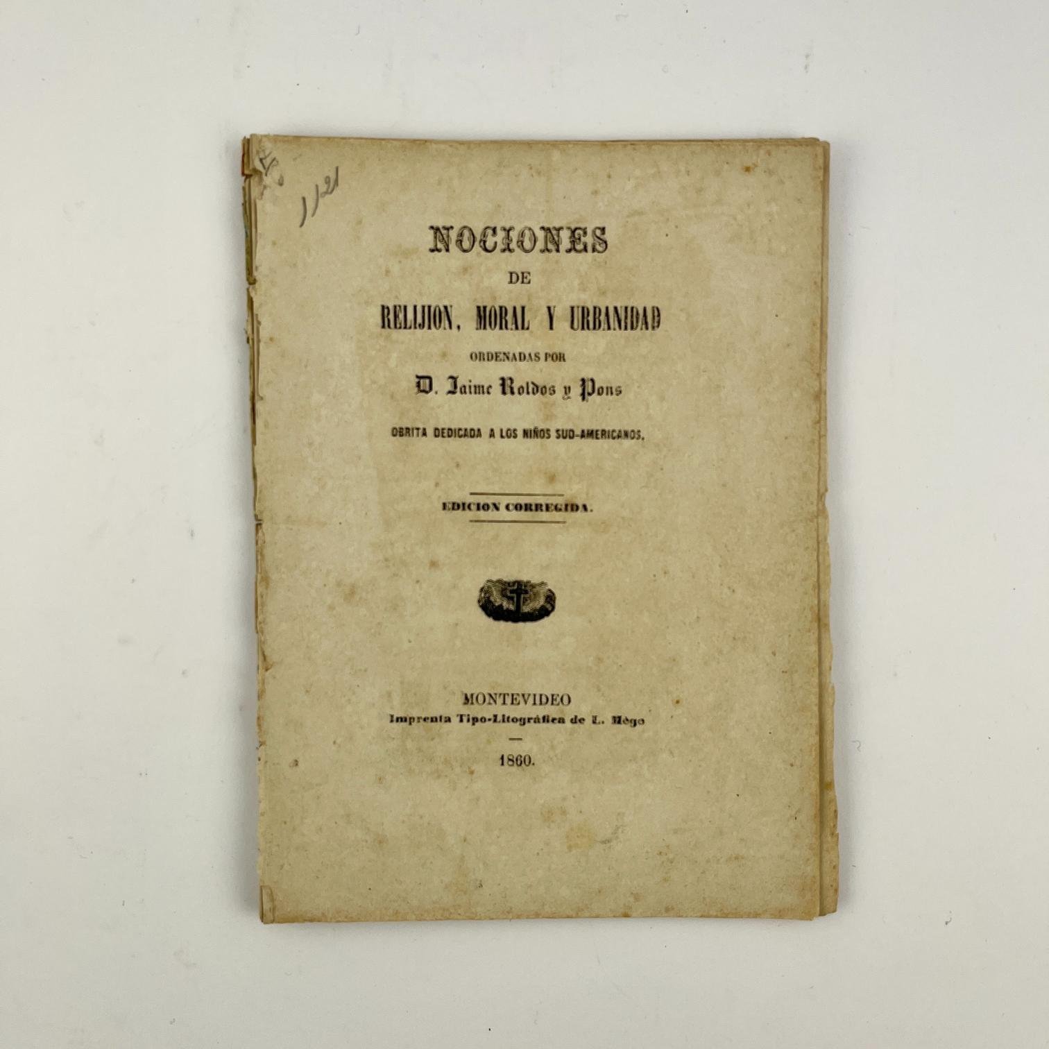 JAIME ROLDOS Y PONS: Nociones de Relijion (sic), Moral y Urbanidad ordenadas por D. … Obrita dedicada a los niños sud-americanos. Edición corregida. Montevideo. Imprenta Tipo-Litográfica de L. Mége. 1860.