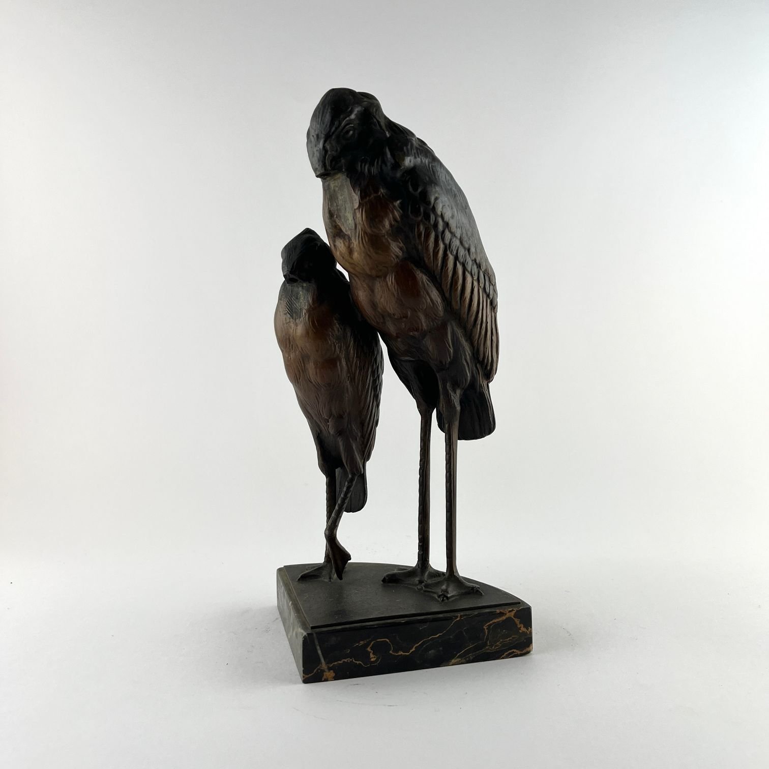 Escultura art decó en bronce pátina marrón. «Garzas.» Alto 21 cm. Presentado sobre peana en granito negro. Alto total 23 cm. Faltan picos en garzas.