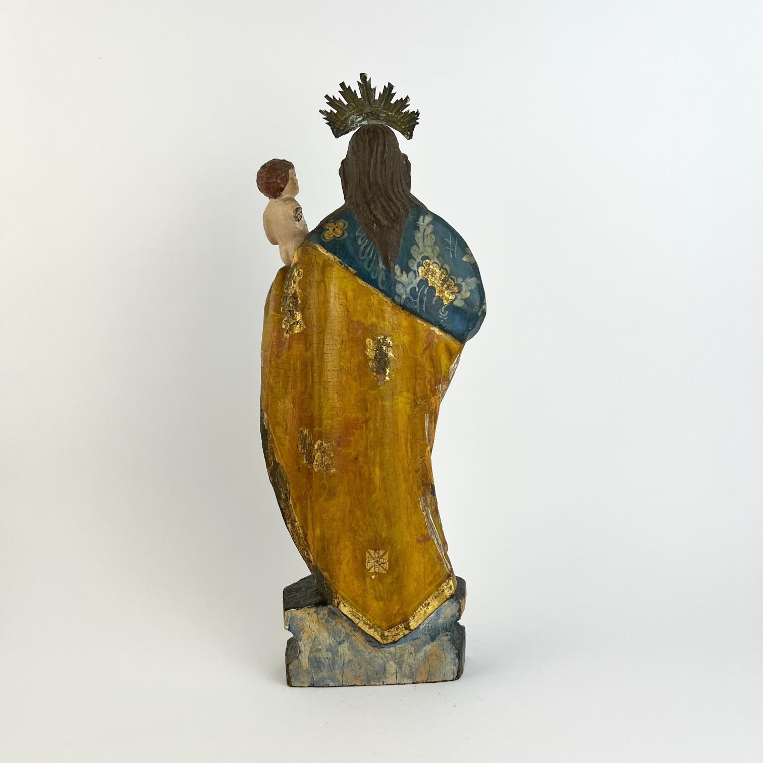 Escultura bahiana s. XVIII en madera tallada y policromada sobre estuco, con detalles en dorado. «San José y el niño.» Alto 17 cm.