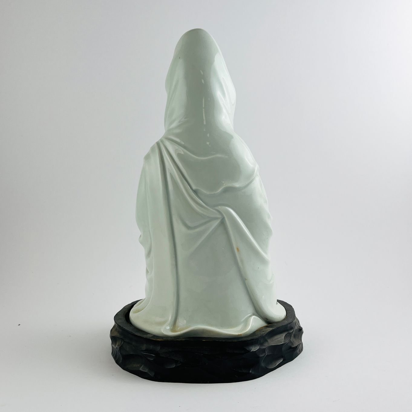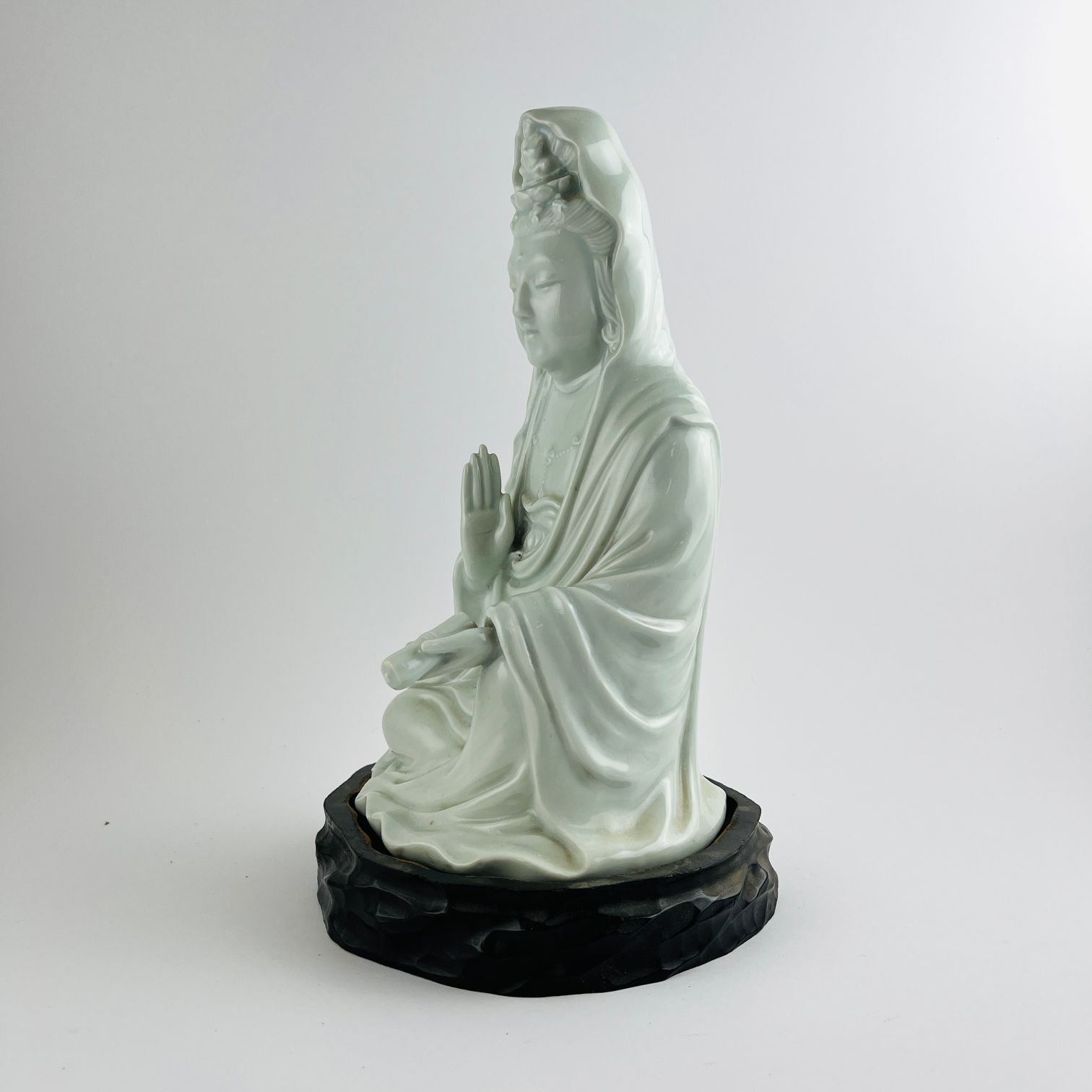 Escultura china en porcelana Blanc de Chine. «Guanyin.» Alto 26 cm. Marcas del período en la base. Base en madera tallada. Alto total 30 cm.