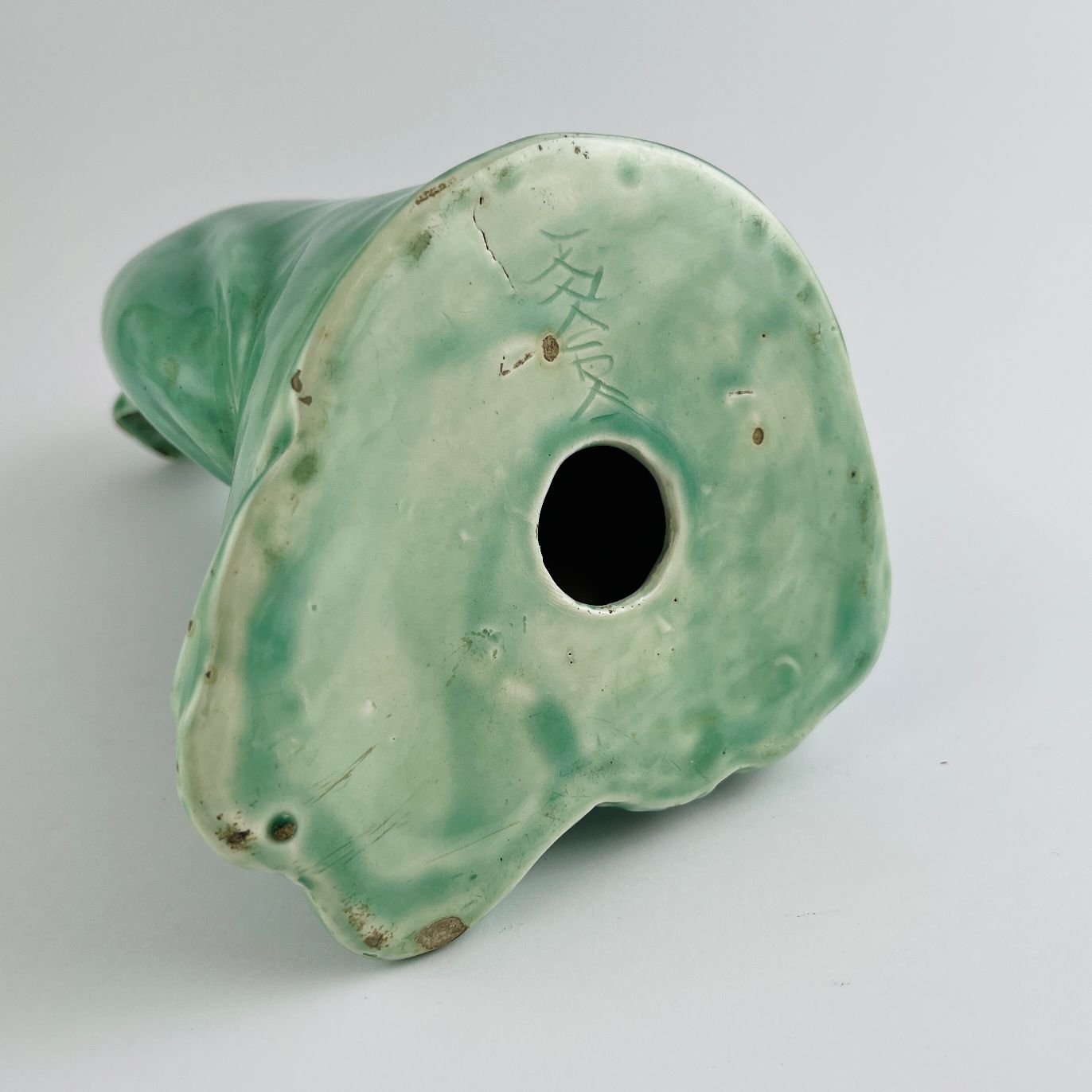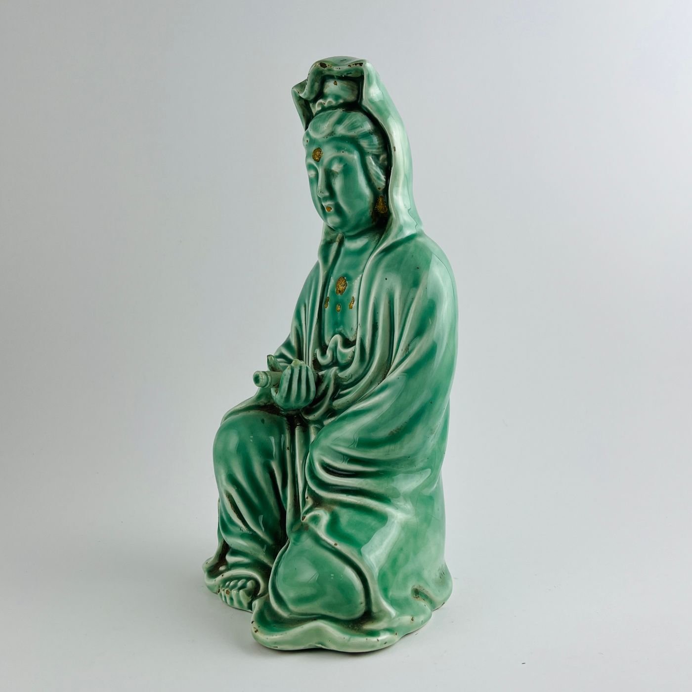 Escultura china en porcelana esmaltada color verde celadón con detalles en dorado. Firmada en la base. Alto 25 cm.