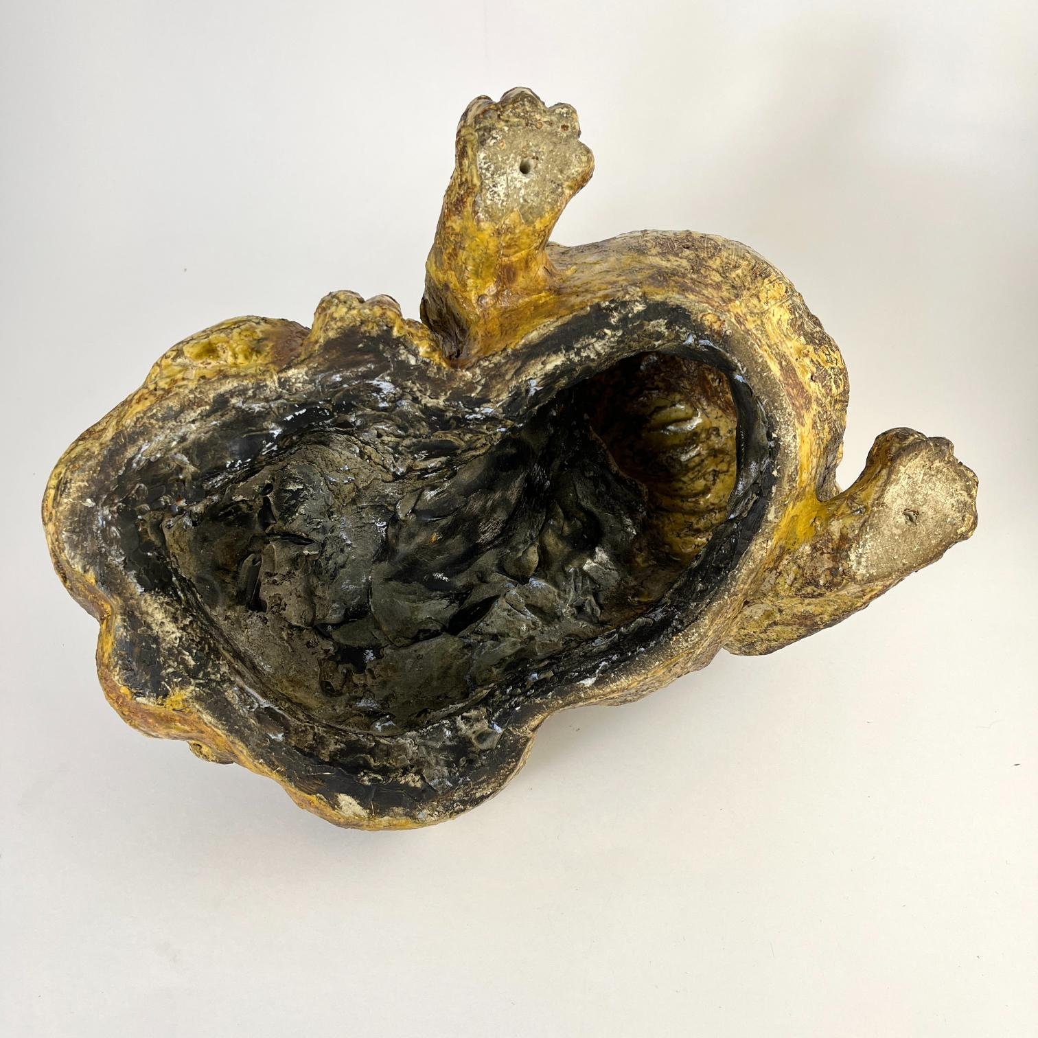 Escultura china en terracota con glaseado en color amarillo. «Perro de fu.» 22 x 30 x 21 cm.