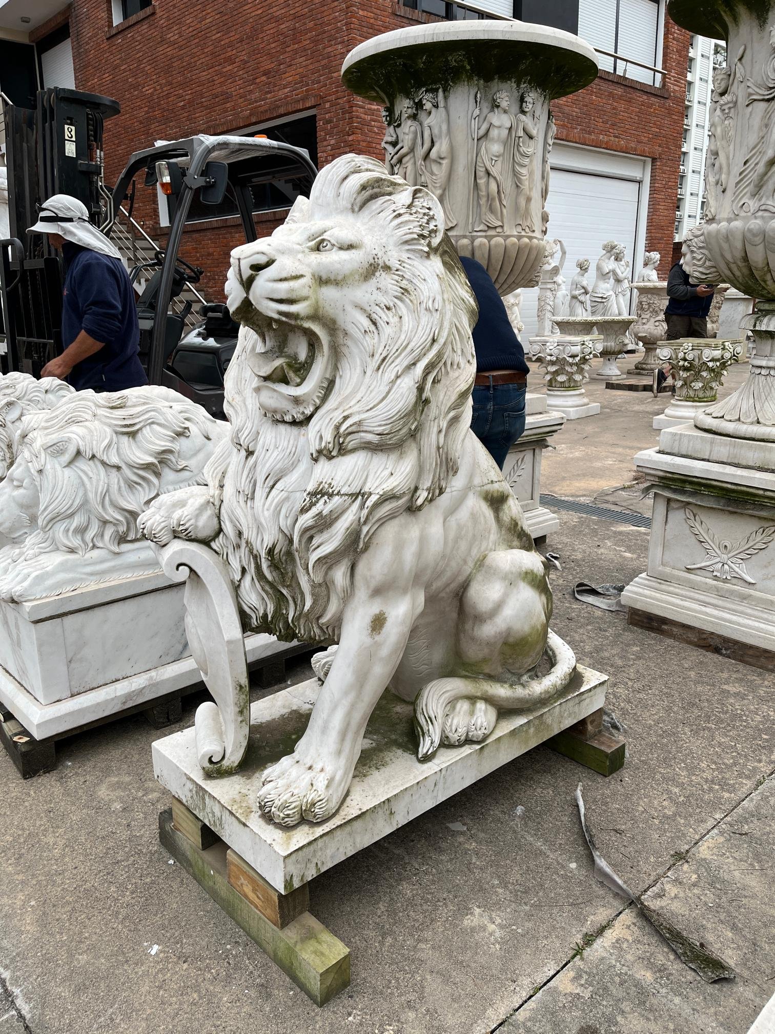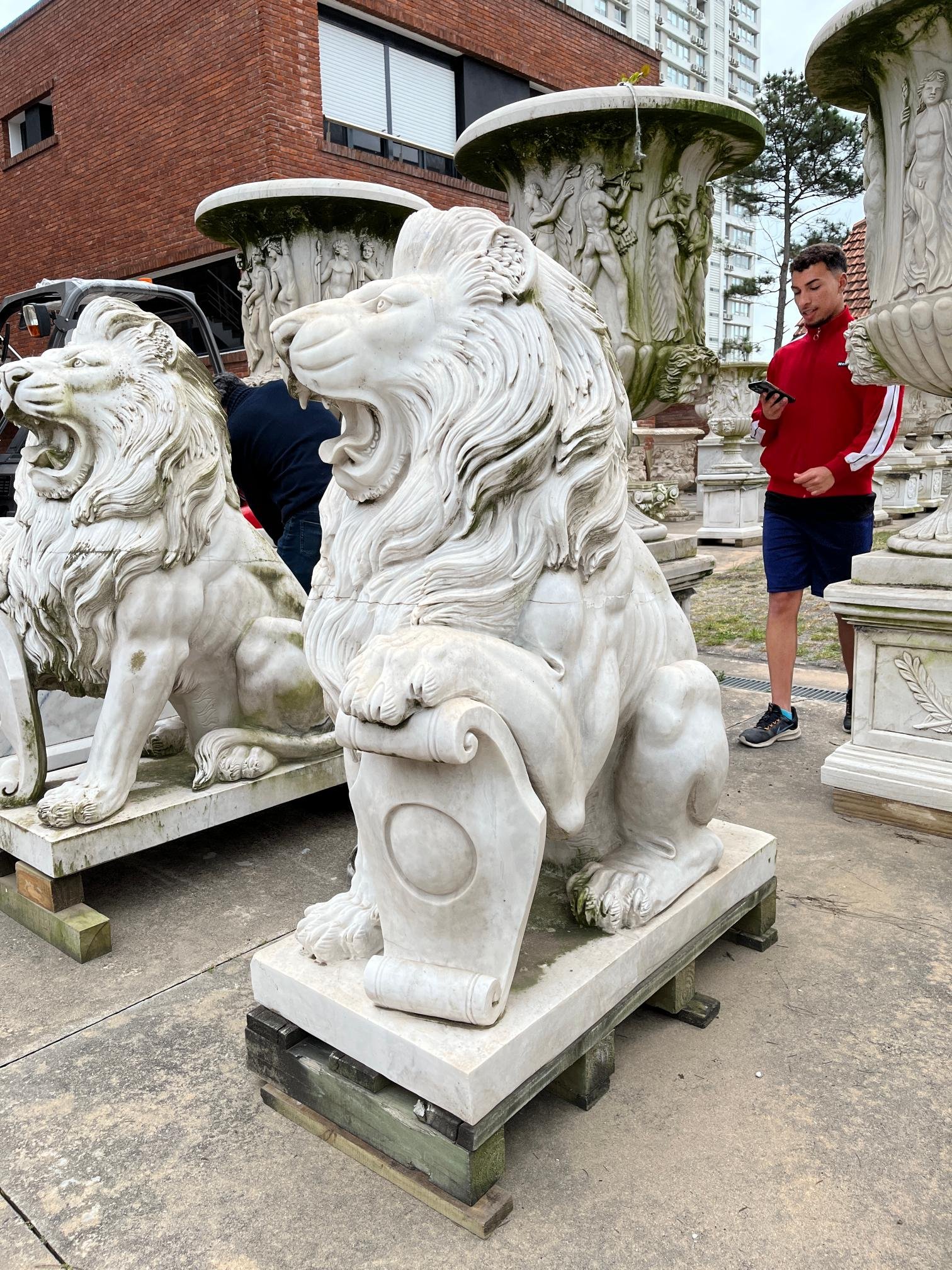 Par de esculturas en mármol blanco veteado. «Leones Marzocco.» Alto 130 cm. Ancho 110 cm. Profundidad 50 cm.