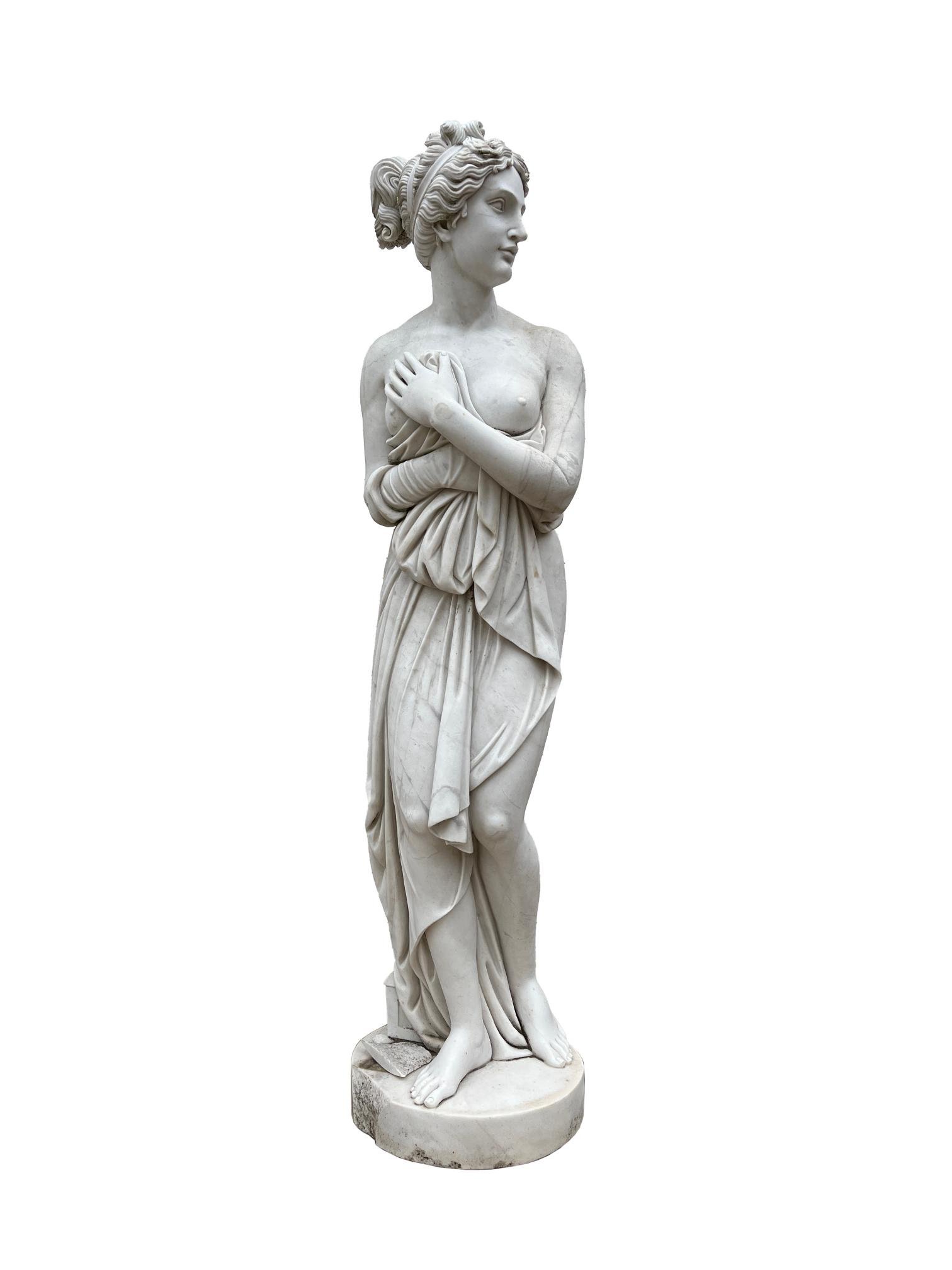 Escultura en mármol blanco veteado. «Venus.» Sellada «Gallería A. Frilli Firenze.» Alto 176 cm. Diámetro de base 45 cm. Presenta avería en base.