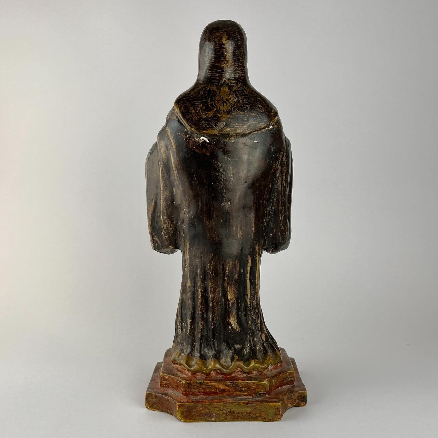Escultura en terracota policromada. «San Amaro”, con manos en estaño. Pequeña cascadura en base. 30,5 x 13 x 11 cm.