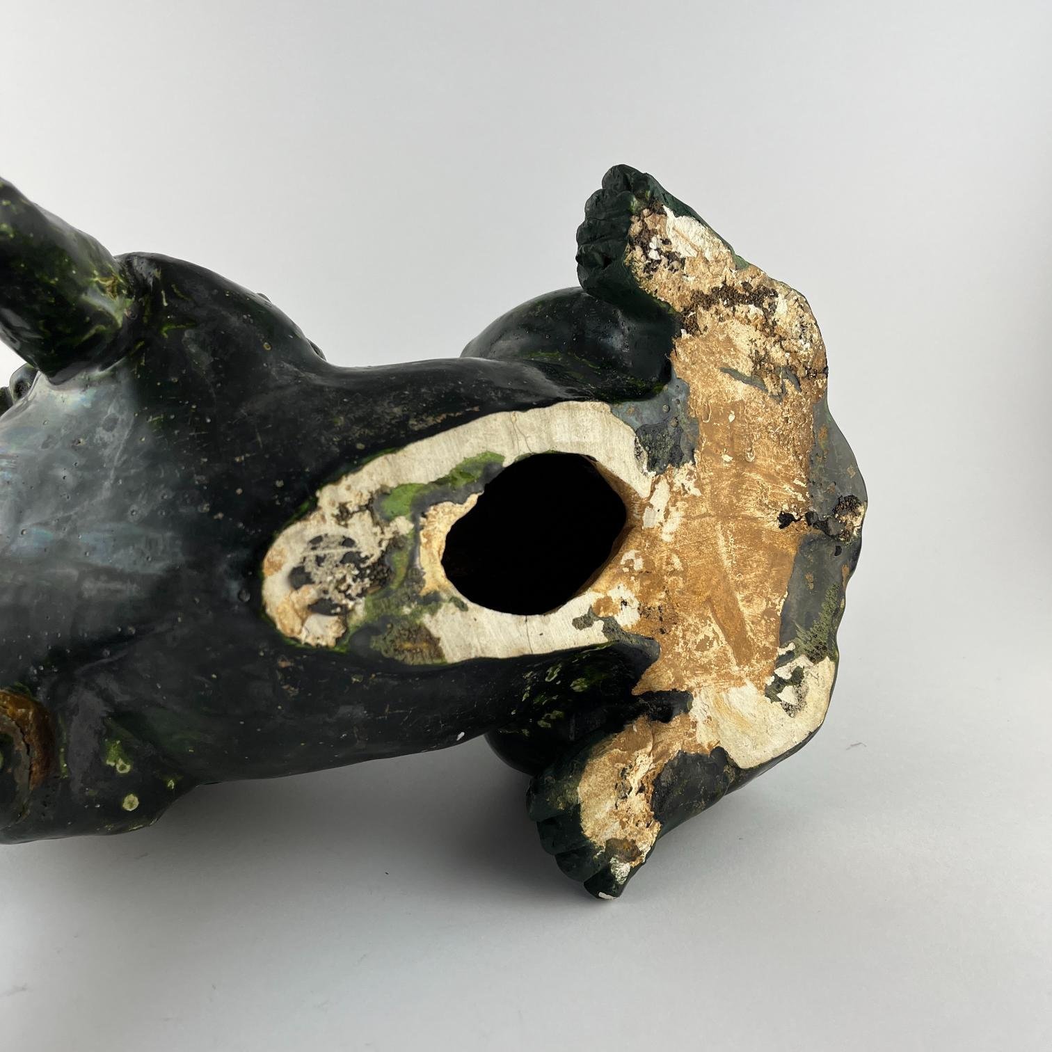 Escultura china en cerámica glaseada color verde oliva. «Perro de fu.» 23 x 30 x 17 cm. Con restauraciones.