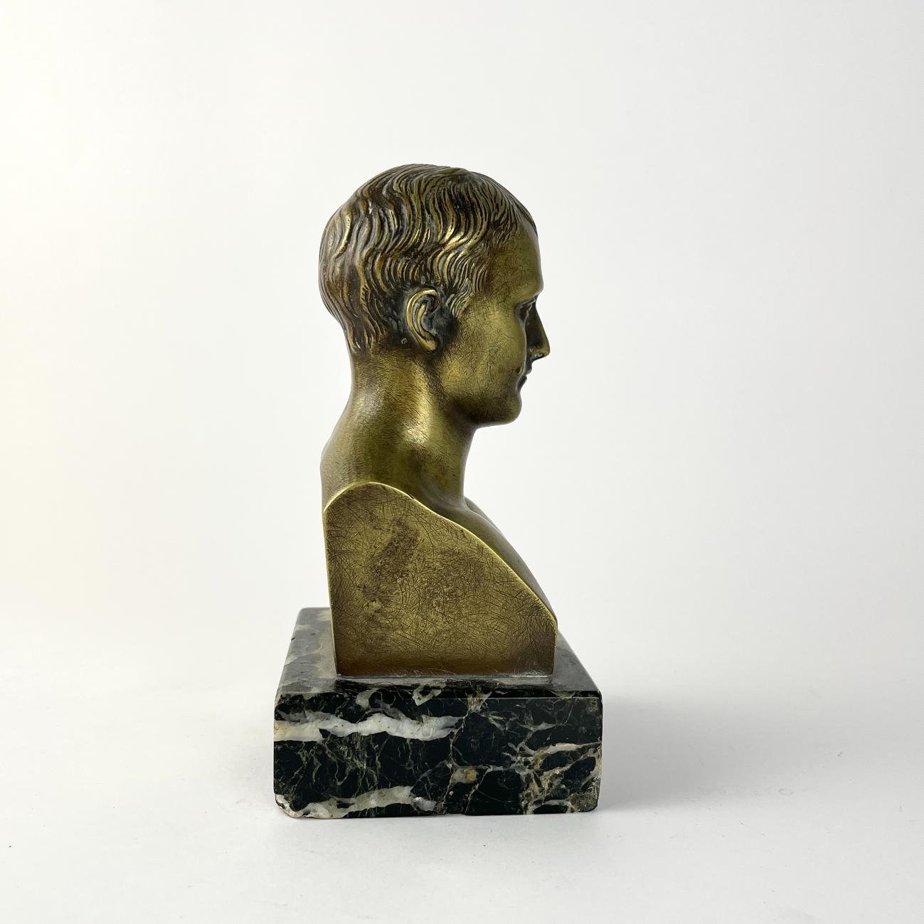 Escultura en bronce. «Busto de Napoleón Bonaparte.» Firmada «L. Kley» atrás, con sello de fundición francés. 13 x 6 cm. Presentado sobre peana en mármol. Alto 16 cm.