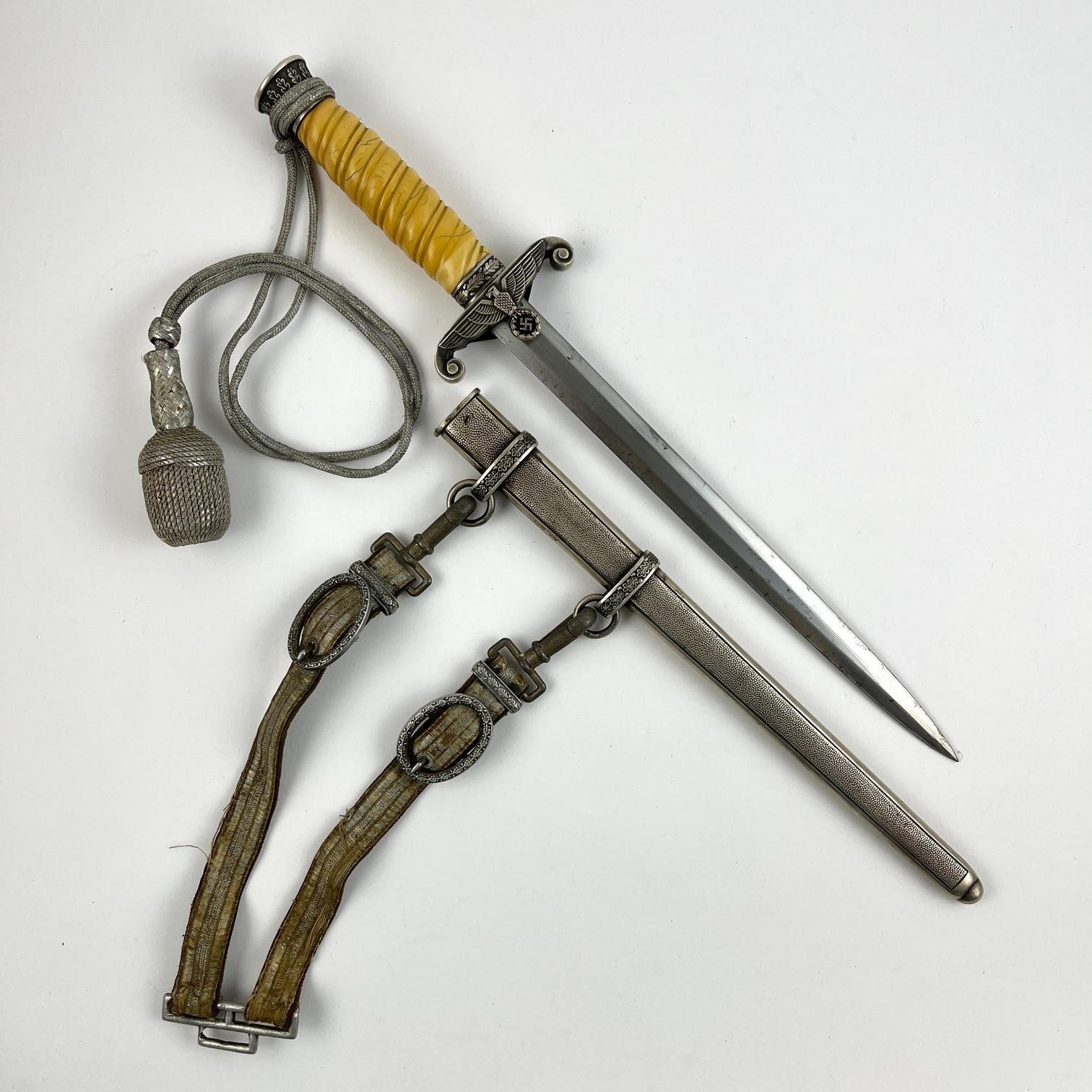 Espadín de oficial del ejército alemán, WWII. Réplica calidad museo. Empuñadura en baquelita blanca gallonada. Pomo esculturado «hojas de roble» y «emblema nacional» en la cruz. Dragona plateada. Vaina en metal plateado, con dos argollas, correas bordadas con pasadores y hebillas. Hoja marcada “Tiger”, Solingen. Largo 37 cm.
