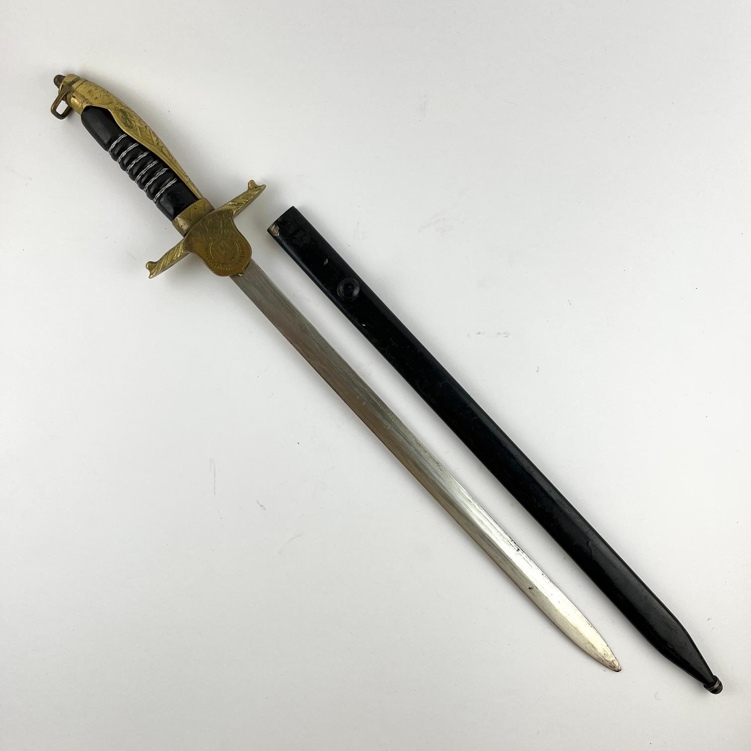 Espadín uruguayo de cadete de la Escuela Nacional de Policía. Empuñadura de baquelita gallonada con torzal de alambre. Escudete con emblema de la policía uruguaya. Vaina en acero color negro. Largo 56 cm.