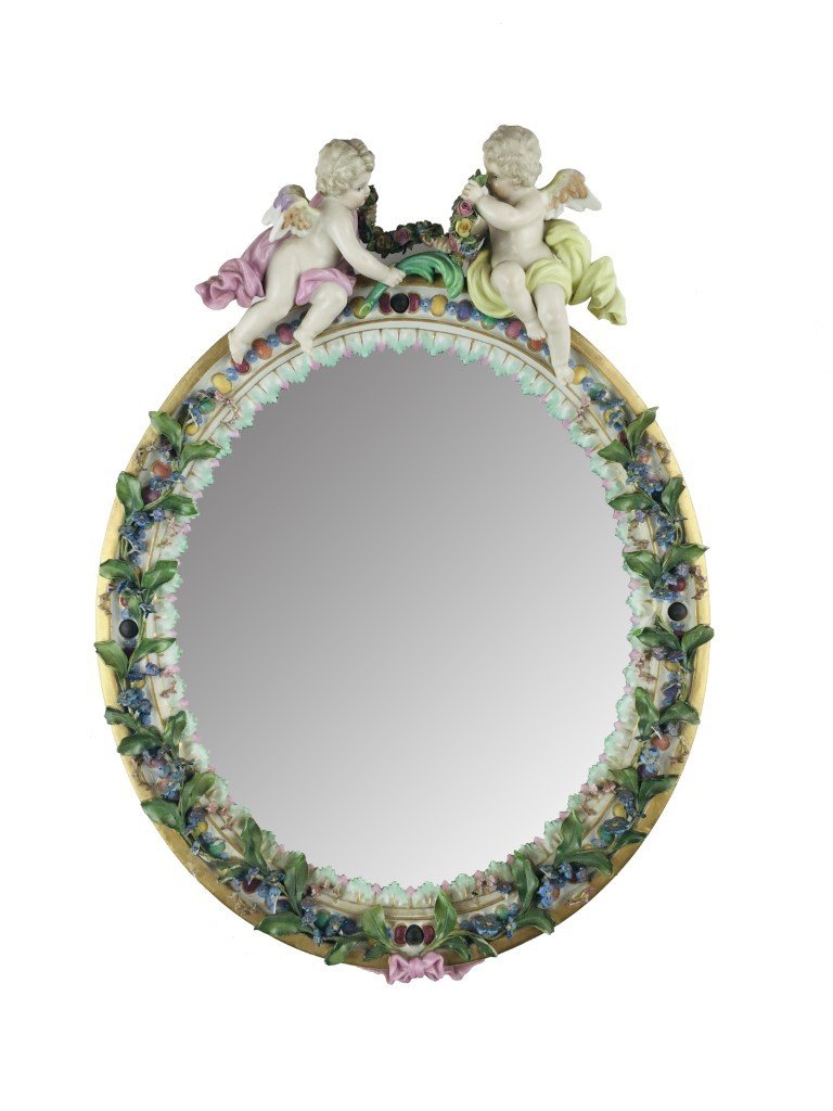 Espejo oval biselado con marco en porcelana de Meissen decorada «ángeles, hojas y flores». 34 x 25 cm. Pequeñas averías.