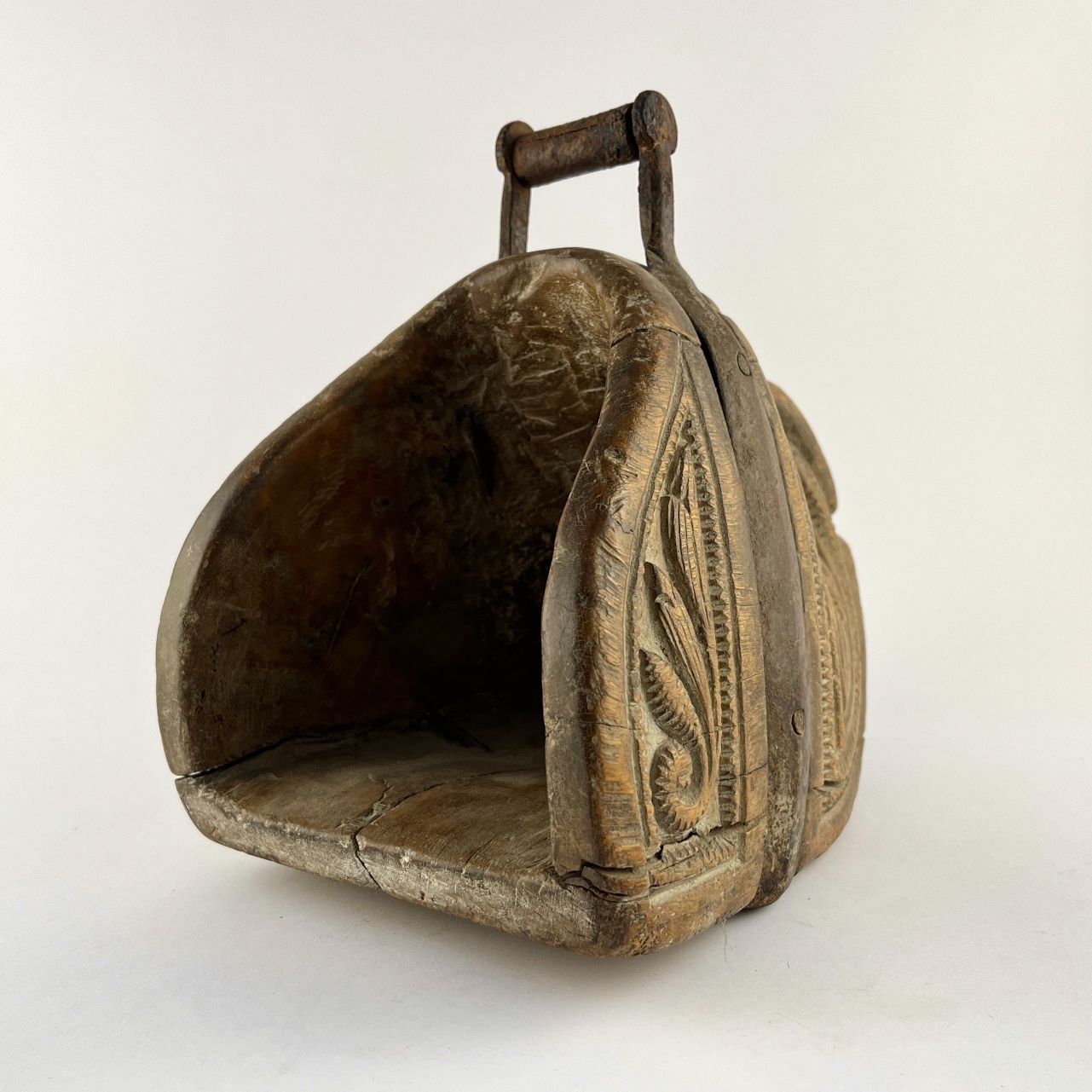Estribo andino s. XVIII en madera tallada «hojas», con arco en hierro forjado. Alto 21 cm.