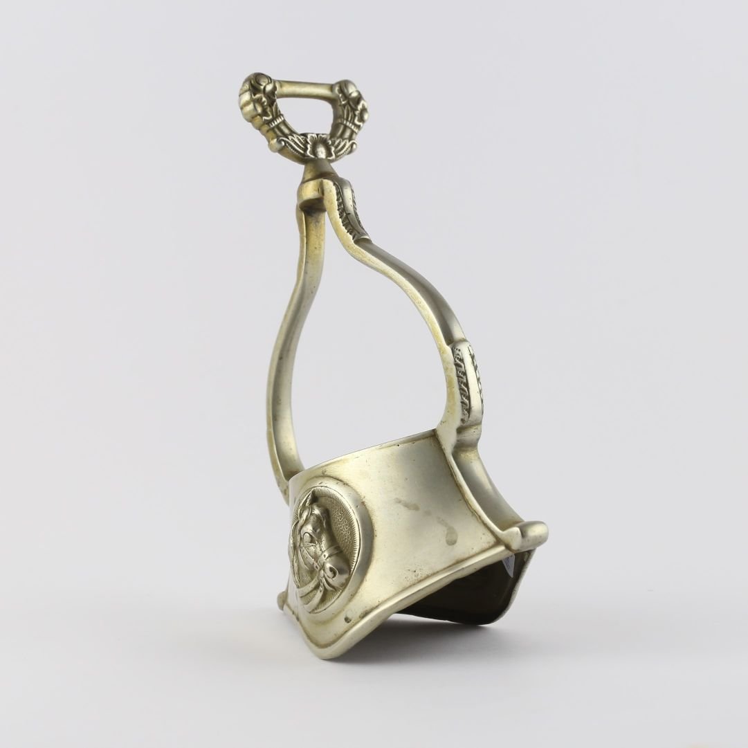 Par de estribos tipo campana en metal blanco decorados «cabeza de caballo».
