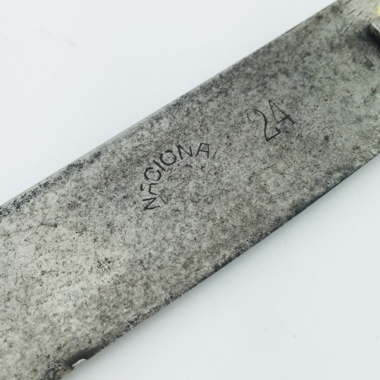 Facón caronero. Hoja «Nacional 24». Cabo en guampa facetada, con remate y virola en alpaca. Gavilán en hierro, mutilado. Largo total 45 cm. Vaina en cuero marrón repujado.