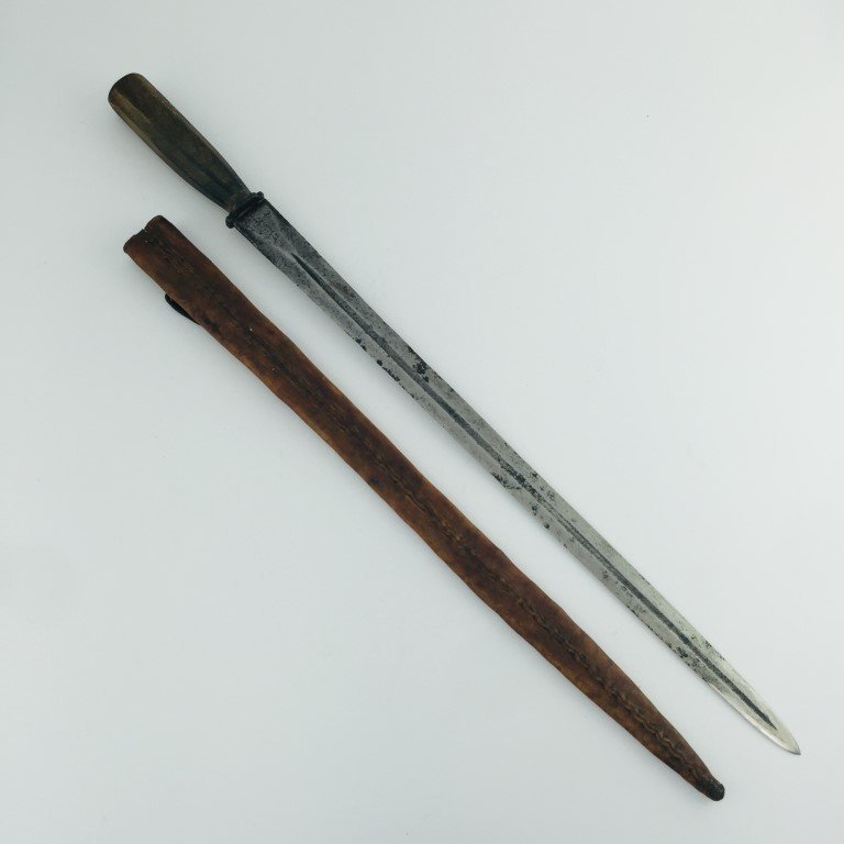 Facón caronero. Hoja «Legítima», Solingen. Con desangrador. Cabo en guampa facetada. Gavilán en hierro forjado, mutilado. Largo total 58 cm. Vaina en cuero crudo.