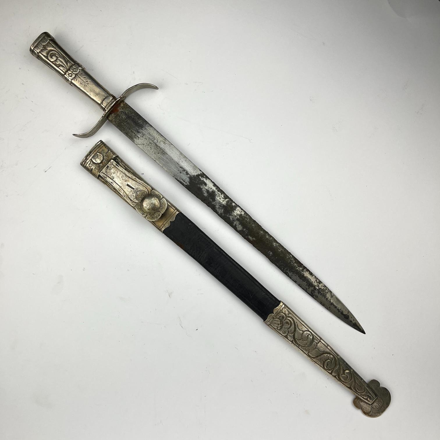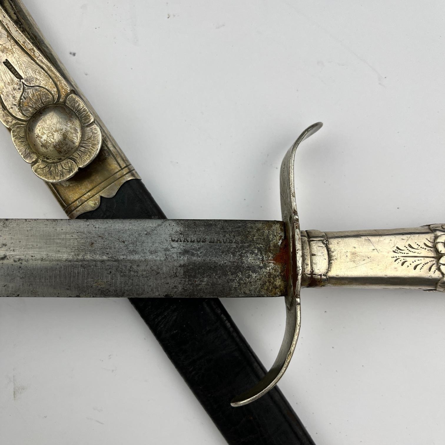 Facón caronero argentino. Cabo, bocavaina y puntera en plata cincelada “hojas y flores”. Vaina picasa en cuero negro. Cabo con punzón del platero P. Bertola. Gancho de vaina con punzón del platero N. Frutos. Largo total 54 cm.