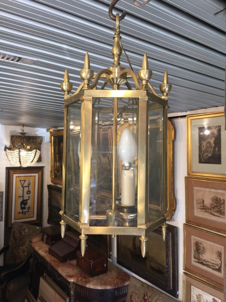 Farol de zaguán octogonal en bronce, tres luces. 50 x 25 cm.