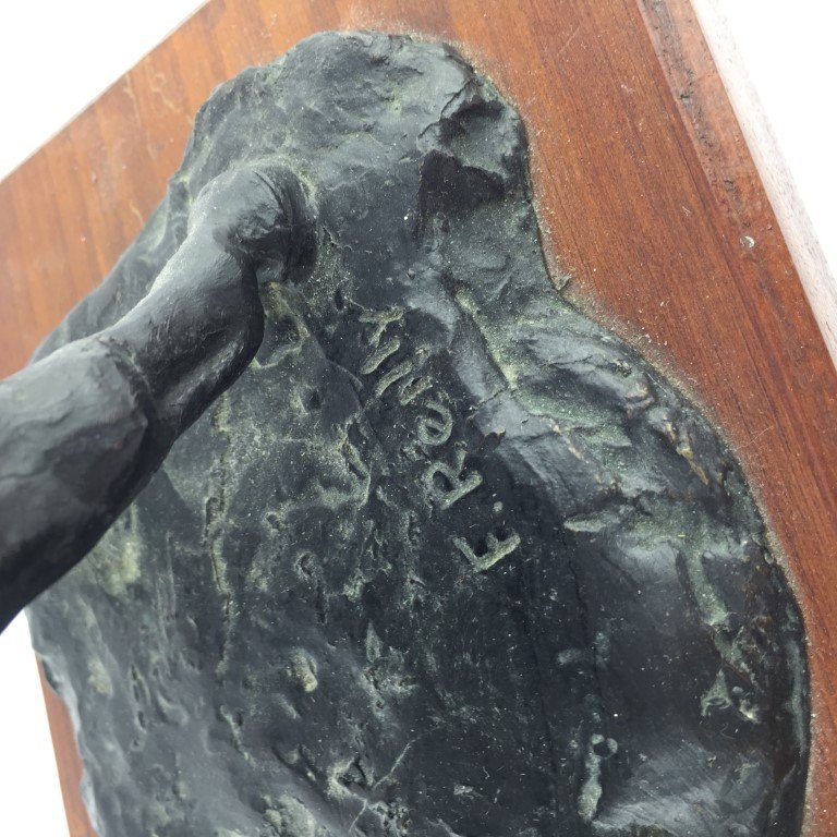 REILLY, Federico (escuela uruguaya, 1922-2012). Escultura en bronce pátina oscura. «Jineteando.» Firmada en la base. 31 x 35 x 12. Presentada sobre base de madera. Alto total 34 cm.