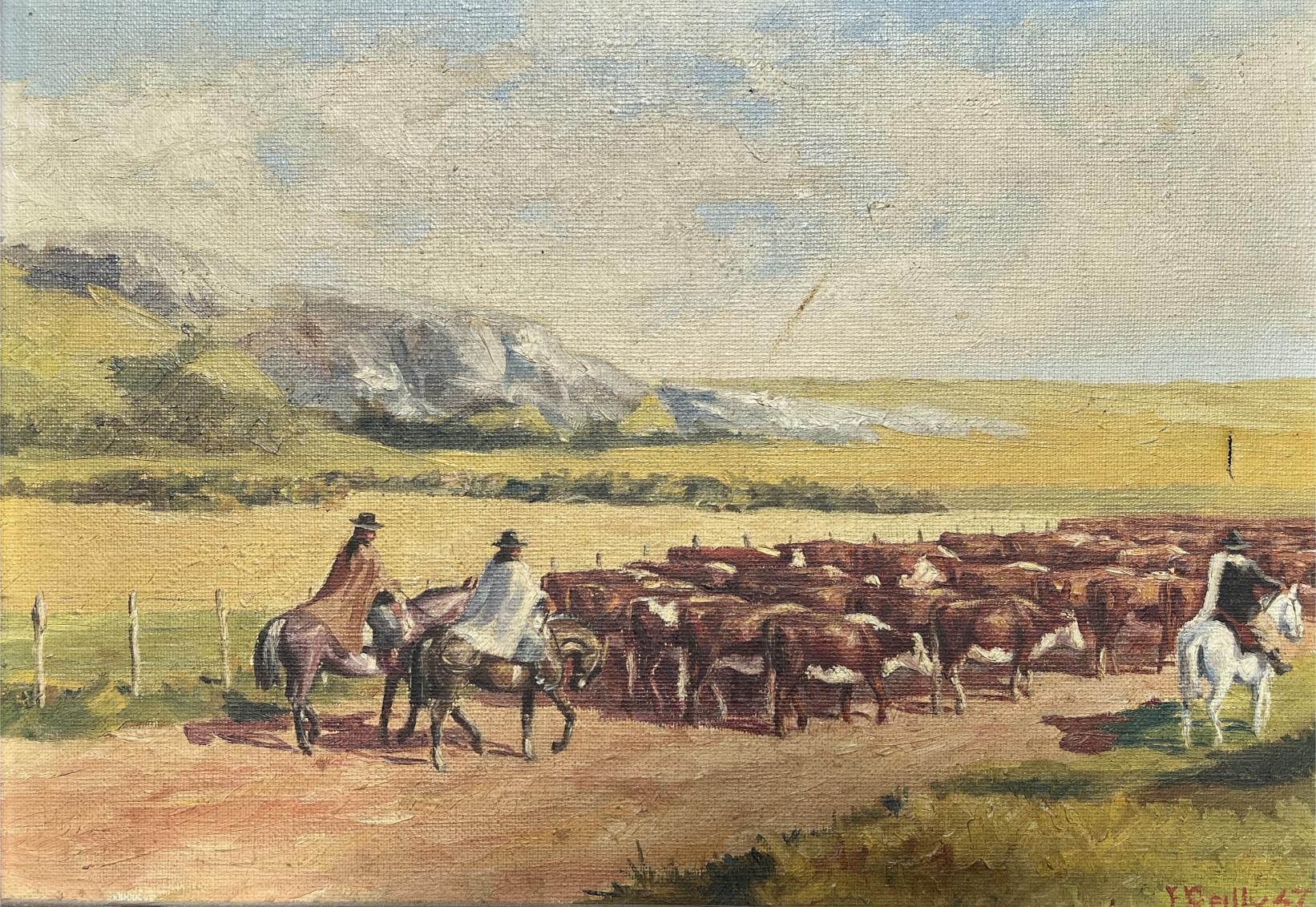 FEDERICO REILLY (escuela uruguaya, 1922-2012). Óleo sobre tela. «Tropeando.» Firmado y fechado «47» abajo a la derecha. 25 x 35 cm. Pequeña avería en tela.