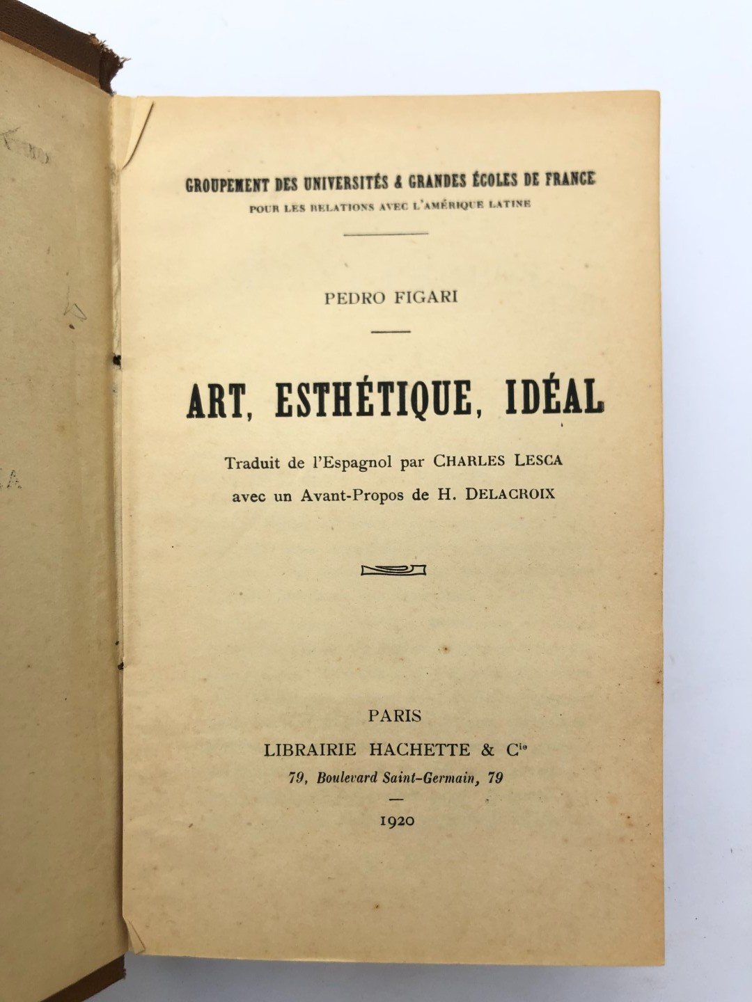 FIGARI, PEDRO: Art, esthétique, idéal. París, libraire Hachette & cia. 1920. Encuadernación en tela. Con averías.