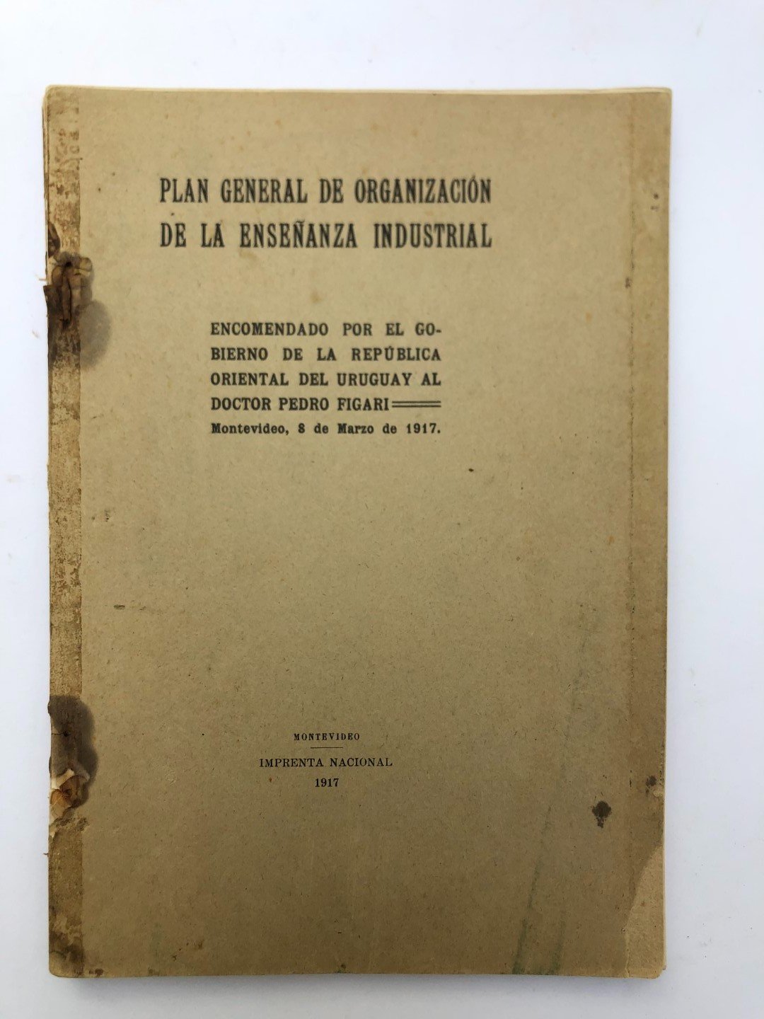 FIGARI, Pedro: Plan general de la organización de enseñanza industrial. Imprenta Nacional, 1917. Encuadernación rústica del editor. Con averías.